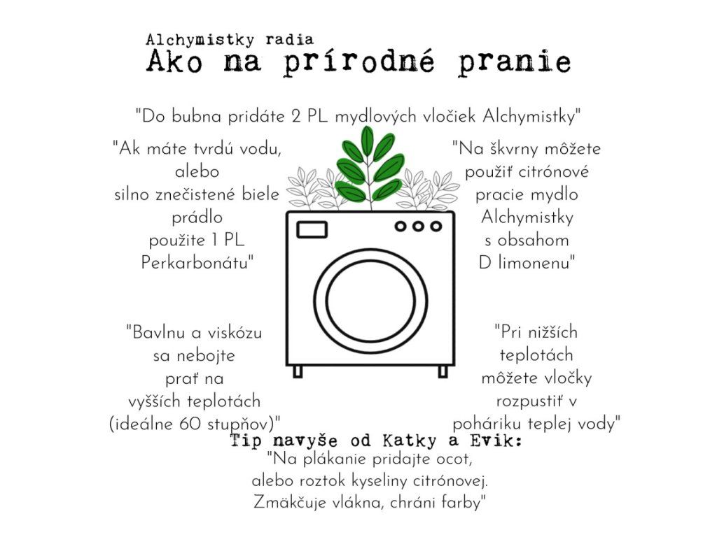 100% kokosové mydlo na pranie – strúhané – bez vône Alchymistky 1 kg 100% kokosové mydlo na pranie je vynikajúcou ekologickou alternatívou klasických pracích prostriedkov. Variant bez vône je vhodný aj pre osoby citlivé na rôzne esenciálne oleje alebo parfémy. Naše mydlo obsahuje zmäkčovač vody – citrát sodný, preto je vhodné aj na pranie v tvrdej vode. Zloženie: 100% sodné kokosové mydlo, voda, glycerín, citrát sodný Použitie mydlových vločiek: Nasypte mydlové vločky priamo do bubnu práčky. Podľa znečistenia a tvrdosti vody pridajte 2-4 PL (20-40g) mydla na 4kg bielizne. Možno pridať 2 PL (20g) sódy na pranie. Vhodné na biele aj farebné prádlo. Teploty prania: 40-90°C. Do pláchania odporúčame pridať klasický ocot (3-4 PL na 4kg bielizne, pri veľmi tvrdej vode aj viac), aby sa odstránili zvyšky mydla z vlákien. TIPY: Pretože klasické mydlo na pranie potrebuje viac mechanického pohybu, než je v bežných práčkach, doporučujeme silne zašpinenú bielizeň, goliere a rukávy košieľ jemne predprať ručne a až potom dať do práčky. Upozornenie: Mydlo má zásadité pH, a preto by sa nikdy nemalo používať na pranie vlny a hodvábu. Treba používať s perkarbonátom sodným - https://www.bioruza.sk/p/yellow-blue-puer-bieliaci-prasok-a-odstranovac-skvrn-na-baze-kyslika-tierra-verde-1-kgDodatočné parametre