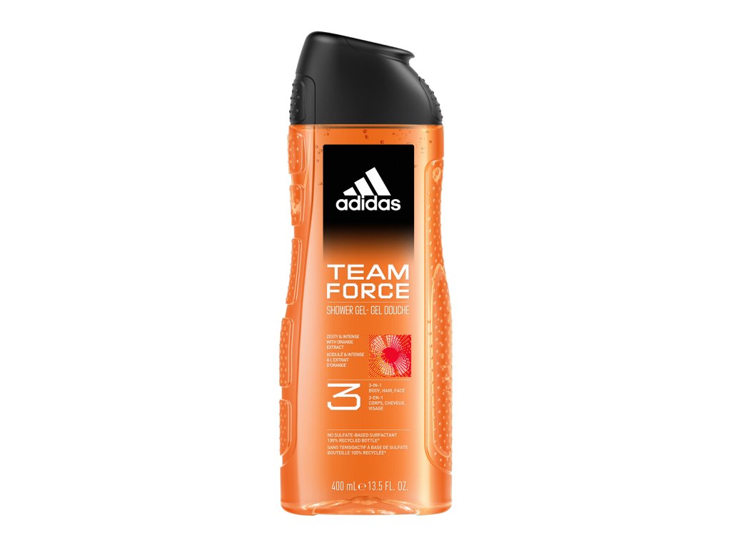 Gél na umývanie tváre, tela a vlasov pre mužov Adidas Team Force s plnou energiou a osviežujúcou vôňou.