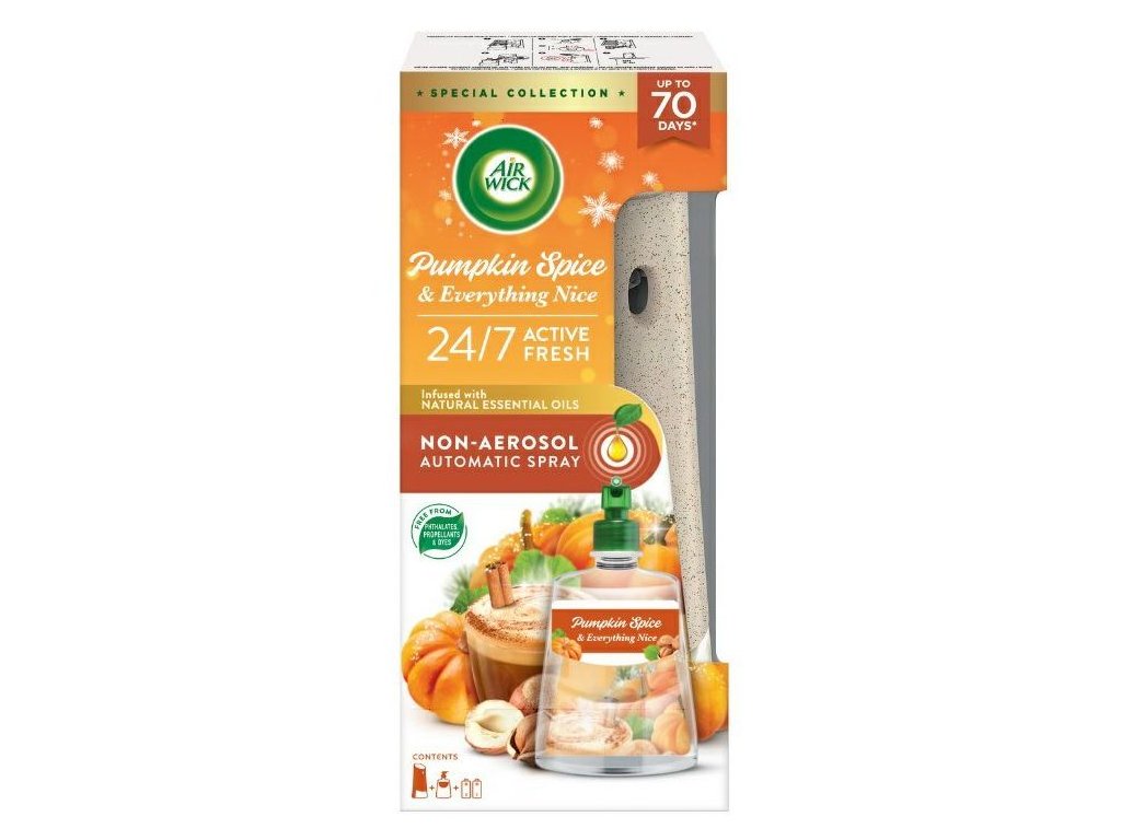 Neaerosólový automatický osviežovač vzduchu na vodnej báze. Užite si očarujúce vône s prírodnými esenciálnymi olejmi. Obohatené o molekuly neutralizujúce zápach, ktoré sa účinne vysporiadajú s nepríjemnými pachmi po dobu až 70 dní. Zloženie na vodnej báze je bez ftalátov, hnacích plynov a farbív. Vôňa: tekvica, škorica, orechy, muškátový oriešok a zázvorDodatočné parametre