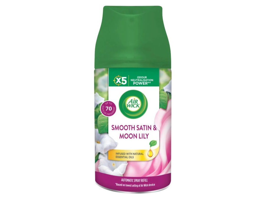 Prevoňajte svoj domov s osviežovačom vzduchu Air Wick Smooth Satin & Moon Lily a prežite pocit čistoty, sviežosti a pokojnej atmosféry — ideálny pre obývačku, spálňu, kúpeľňu alebo predsieň.Objem balenia 250ml.Dodatočné parametre