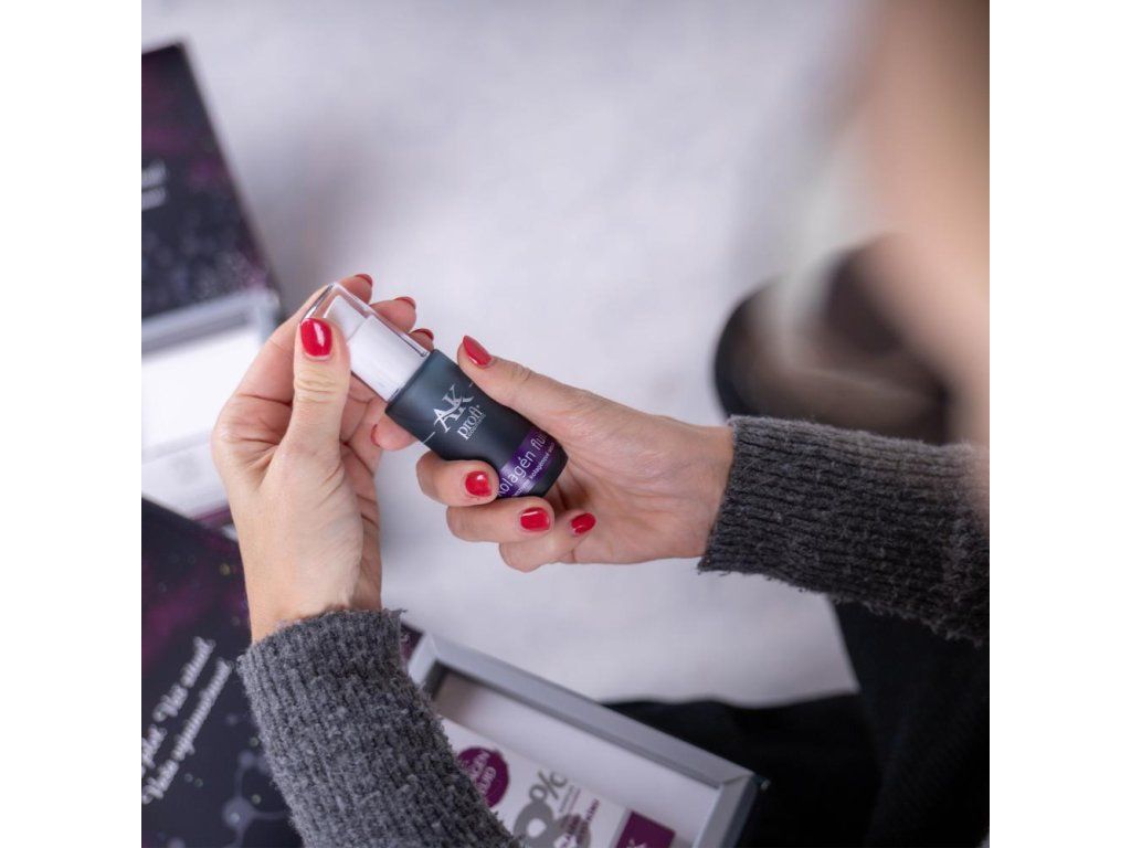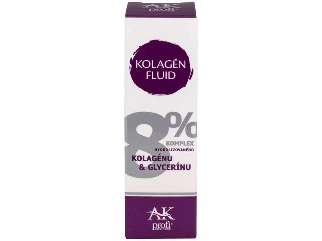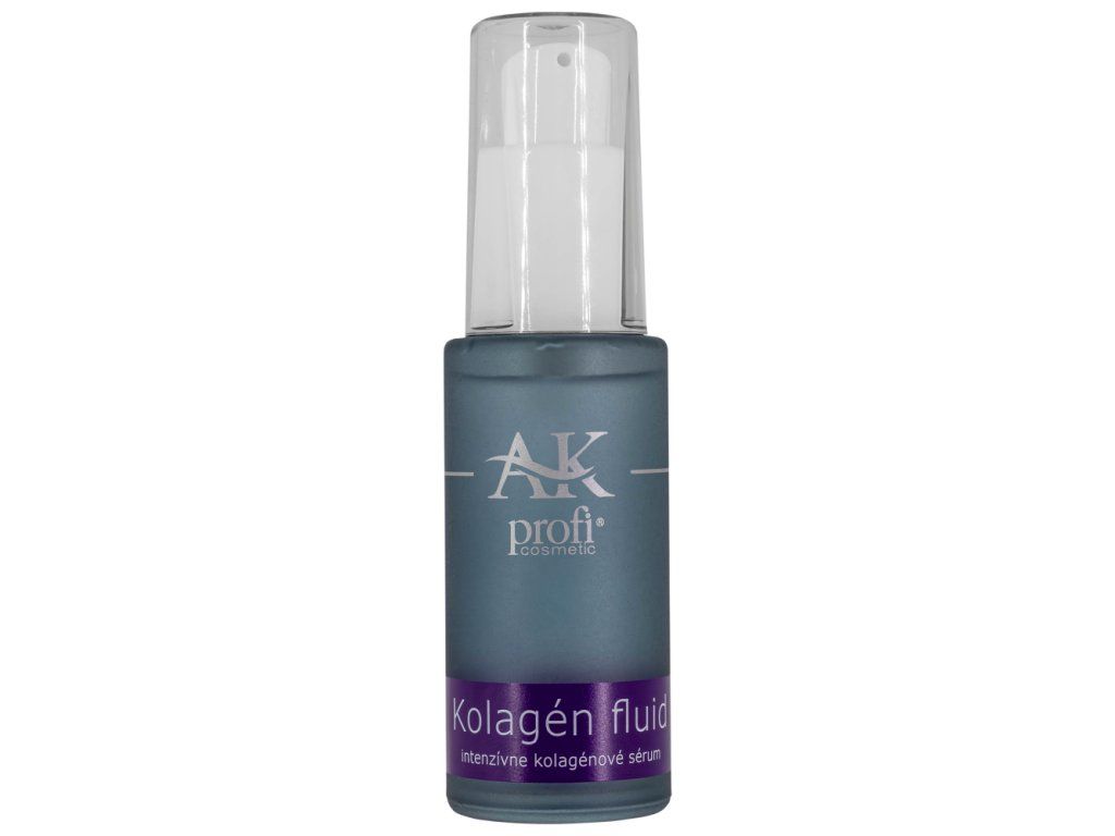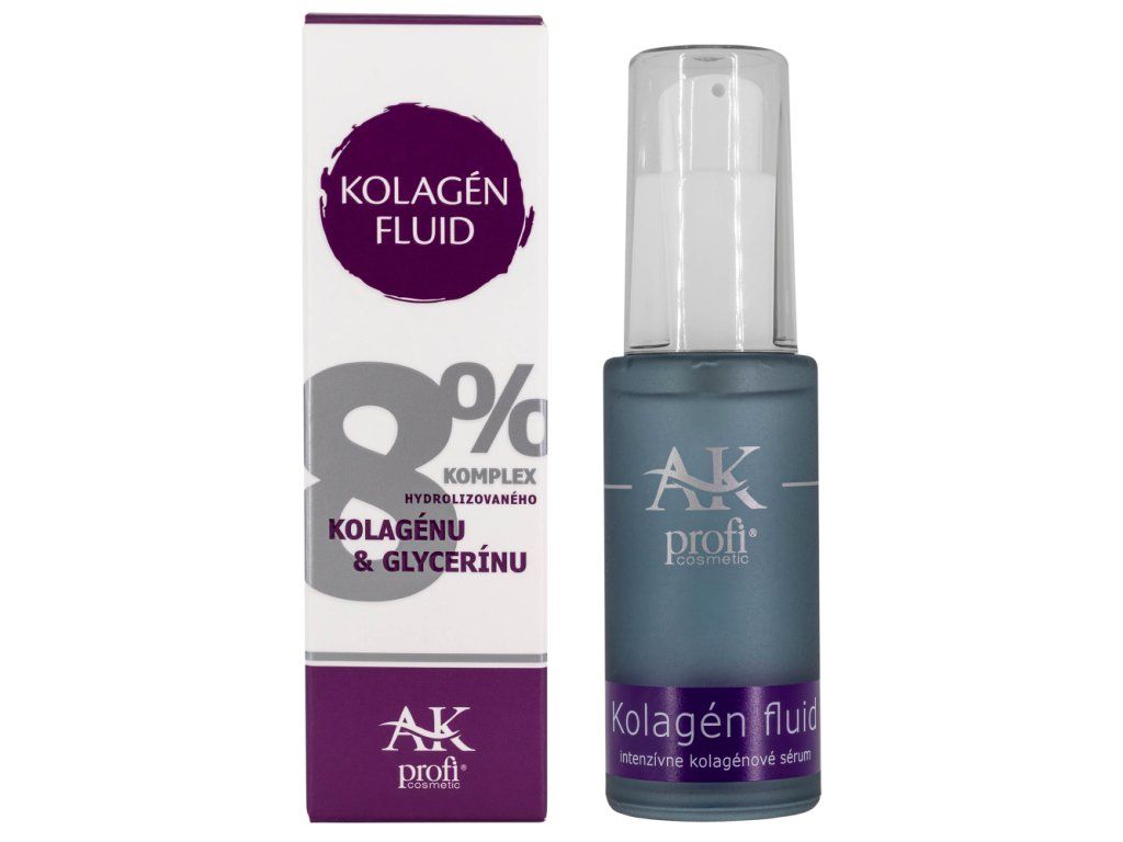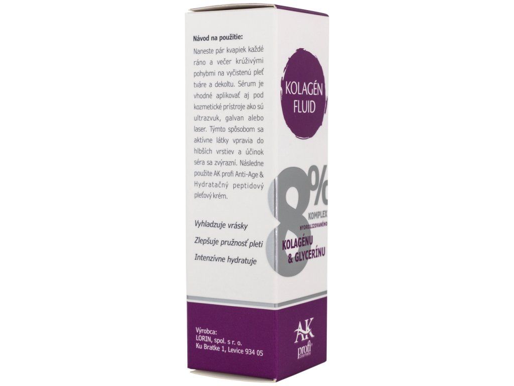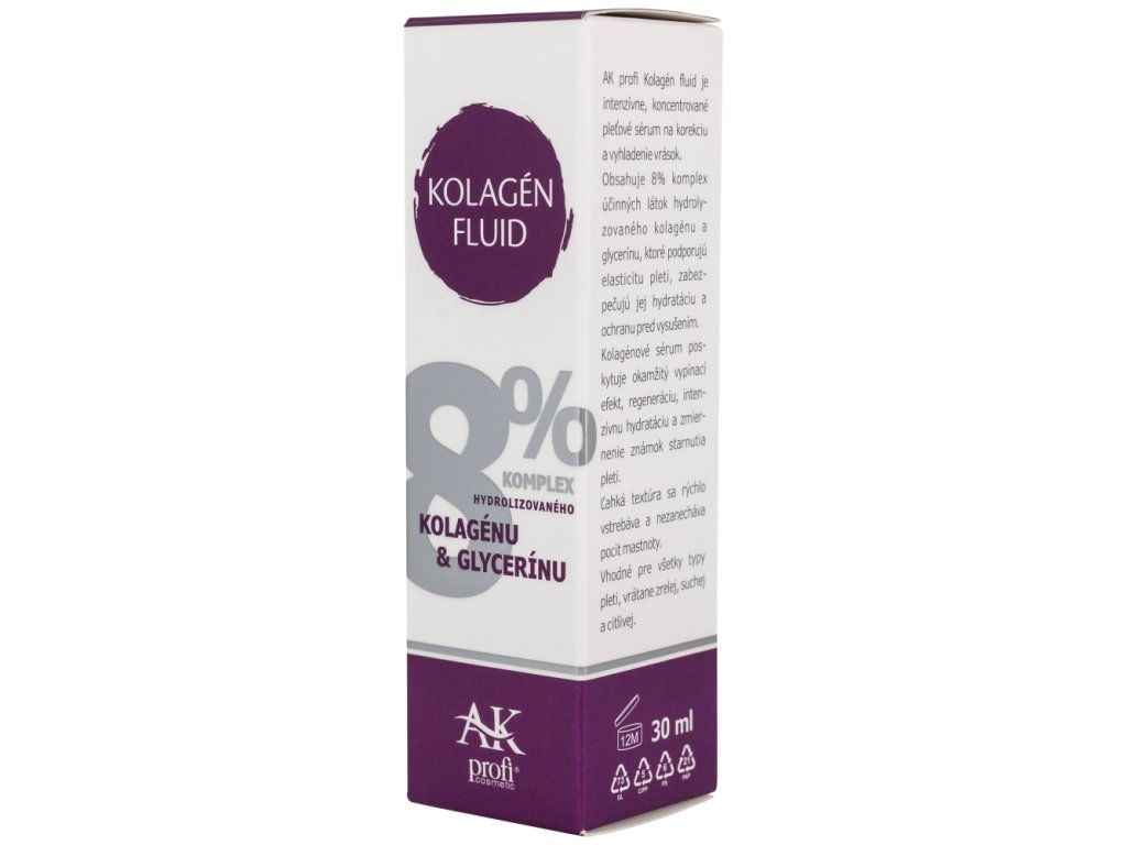 AK profi Kolagén fluid je intenzívne, koncentrované pleťové sérum na korekciu a vyhladenie vrások. Obsahuje 8% komplex účinných látok hydrolyzovaného kolagénu a glycerínu, ktoré podporujú elasticitu pleti, zabezpečujú jej hydratáciu a ochranu pred vysušením. Kolagénové sérum poskytuje okamžitý vypínací efekt, vyhladenie vrások, regeneráciu, intenzívnu hydratáciu a zmiernenie známok starnutia pleti. Ľahká textúra sa rýchlo vstrebáva a nezanecháva pocit mastnoty. Vhodné pre všetky typy pleti, vrátane zrelej, suchej a citlivej. Bez parfumácie. Návod na použitie Naneste pár kvapiek každé ráno a večer krúživými pohybmi na vyčistenú pleť tváre a dekoltu. Sérum je vhodné aplikovať aj pod kozmetické prístroje ako sú ultrazvuk, galvan alebo laser. Týmto spôsobom sa aktívne látky vpravia do hlbších vrstiev a účinok séra sa zvýrazní. Následne použite AK profi Anti-Age & Hydratačný peptidový pleťový krém.Dodatočné parametre