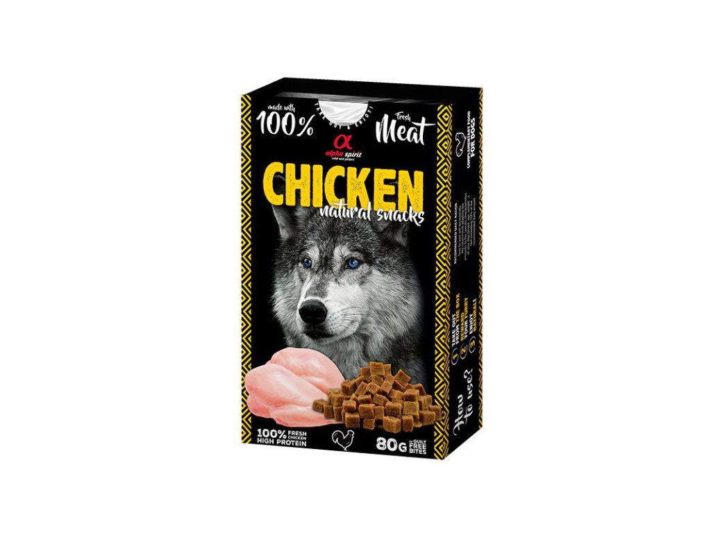 Alpha Spirit Natural Snack - sušené kuracie mäso je "home made" pamlsok vyrábaný vo vlastnej kuchyni španielského výrobcu Alpha Spirit. Tieto mimoriadne chutné kúsky z čerstvého mäsa sú sušené unikátnym spôsobom tak, aby si zachovali nutričné hodnoty čerstvého mäsa. Zároveň však kúsky mäsa zostávajú mäkké a voňavé.Dodatočné parametre