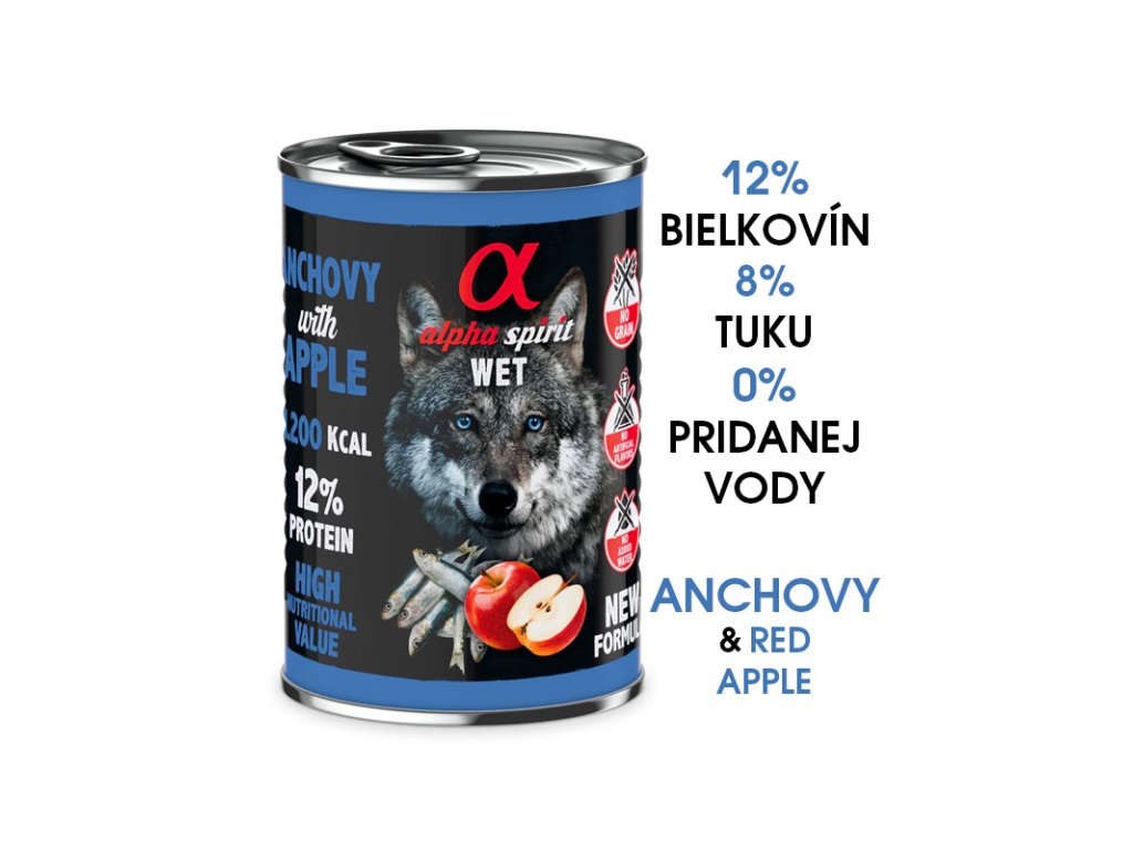 AKCIA 6+1 zdarma do 31.12.2023 Alpha Spirit Dog Wet - Anchovy & Red Apple je kompletná plnohodnotná strava pre Vášho psa v každom štádiu vývoja, či už je pes šteňaťom, dospelým psom alebo seniorom. Alpha Spirit mokrá strava v konzerve je unikátna použitím len čerstvých rýb a čerstvého ovocia. Bez pridania dodatočnej vody a tak 400g konzerva je výživnejšia oproti konkurenčným konzervám.Dodatočné parametre
