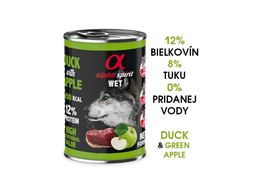 AKCIA 6+1 zdarma do 31.12.2023 Alpha Spirit Dog Wet - Duck & Green Apple je kompletná plnohodnotná strava pre Vášho psa v každom štádiu vývoja, či už je pes šteňaťom, dospelým psom alebo seniorom. Alpha Spirit mokrá strava v konzerve je unikátna použitím len čerstvého mäsa a čerstvého ovocia. Bez pridania dodatočnej vody a tak 400g konzerva je viac výživnejšia oproti konkurenčným konzervám.Dodatočné parametre