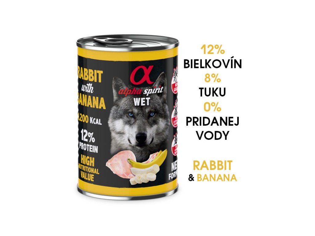 AKCIA 6+1 zdarma do 31.12.2023 Alpha Spirit Dog Wet - Rabbit & Banana je kompletná plnohodnotná strava pre Vášho psa v každom štádiu vývoja, či už je pes šteňaťom, dospelým psom alebo seniorom. Alpha Spirit mokrá strava v konzerve je unikátna použitím len čerstvého mäsa a čerstvého ovocia. Bez pridania dodatočnej vody a tak 400g konzerva je viac výživnejšia oproti konkurenčným konzervám.Dodatočné parametre