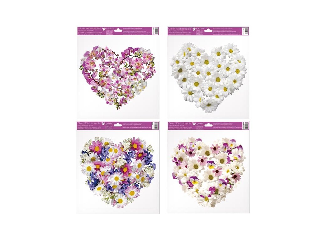Dekoračná okenná fólia - srdce z kvetov. Okenné fólie neobsahujú lepidlo. Na plochu priľnú elektrostaticky a nezanechávajú teda po sebe žiadnu stopu. Vhodné sú akékoľvek hladké plochy, napríklad sklo, výlohy, zrkadlá alebo kachličky. Čisté - bez lepidla - opakovane použiteľné. NÁVOD: 1. Odporúčame pred použitím plochu očistiť od prachu a iných nečistôt. 2. Fólia sa ľahko aplikuje sňatím z podkladového papiera a umiestnením na hladkú plochu. 3. Fóliu priložte a vyhlaďte prípadné bublinky rukou alebo suchou handričkou. 4. Po použití je možné ich uložiť na pôvodný podkladový papier a uskladniť na ďalšiu sezónu. Dodávame v mixe po 4 ks podľa skladovej zásoby. Uvedená cena je za 1 ks.Dodatočné parametre