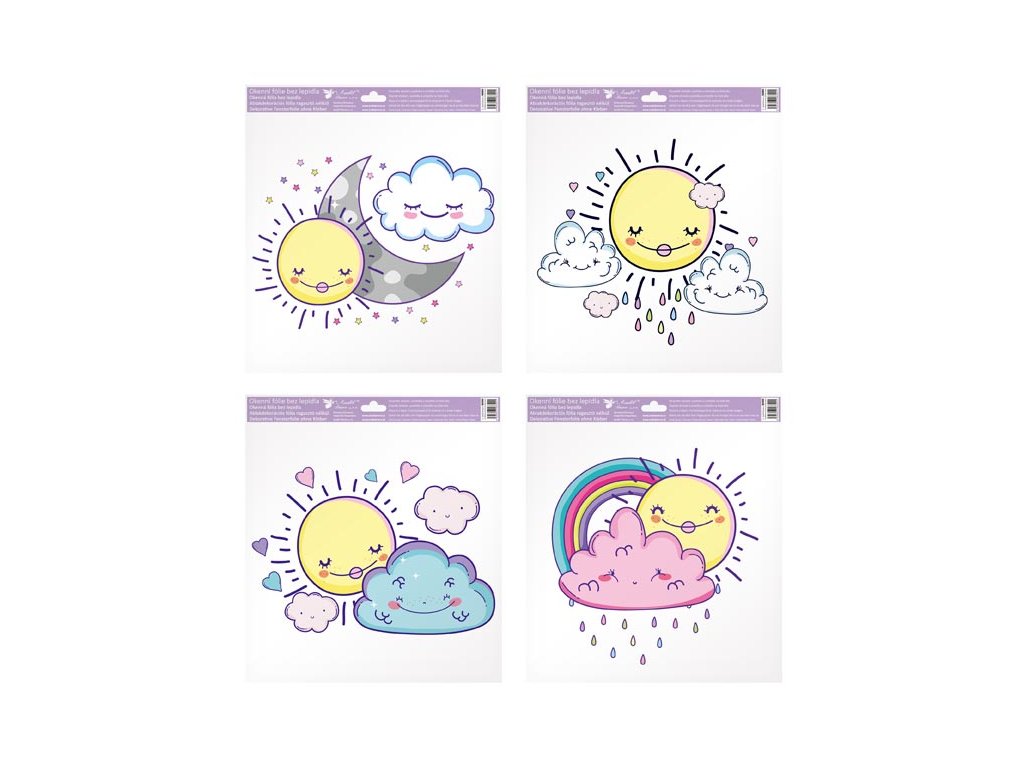 Dekoračná okenná fólia - slniečka. Okenné fólie neobsahujú lepidlo. Na plochu priľnú elektrostaticky a nezanechávajú teda po sebe žiadnu stopu. Vhodné sú akékoľvek hladké plochy, napríklad sklo, výlohy, zrkadlá alebo kachličky. Čisté - bez lepidla - opakovane použiteľné. NÁVOD: 1. Odporúčame pred použitím plochu očistiť od prachu a iných nečistôt. 2. Fólia sa ľahko aplikuje sňatím z podkladového papiera a umiestnením na hladkú plochu. 3. Fóliu priložte a vyhlaďte prípadné bublinky rukou alebo suchou handričkou. 4. Po použití je možné ich uložiť na pôvodný podkladový papier a uskladniť na ďalšiu sezónu. Dodávame v mixe po 4 ks podľa skladovej zásoby. Uvedená cena je za 1 ks.Dodatočné parametre