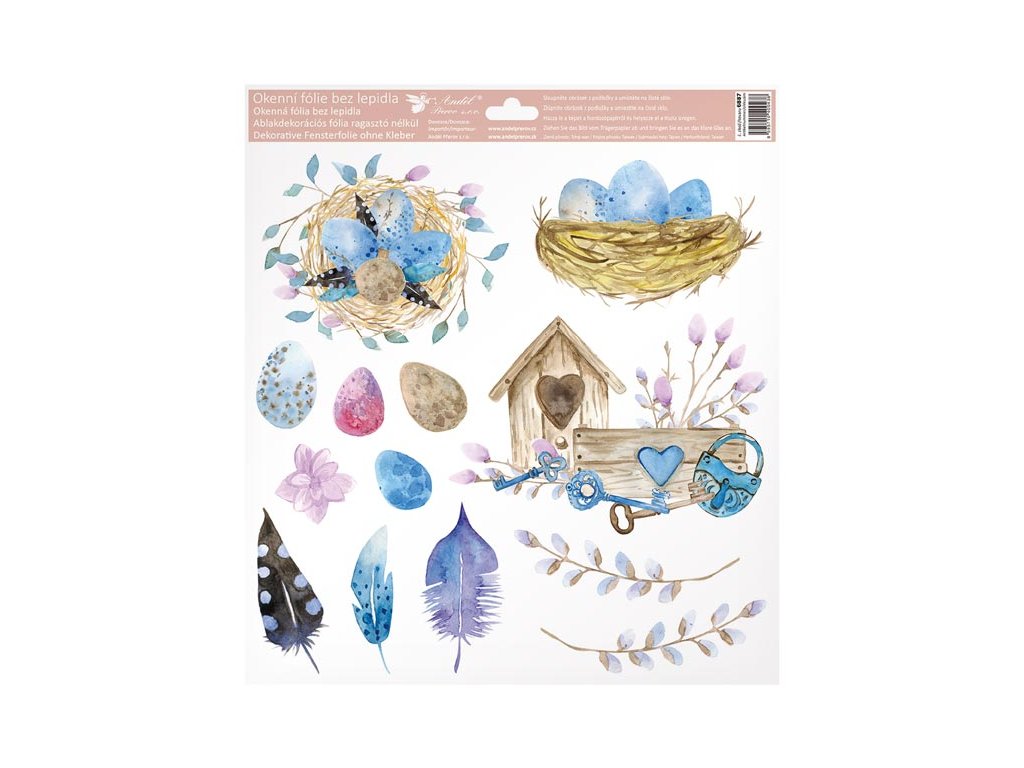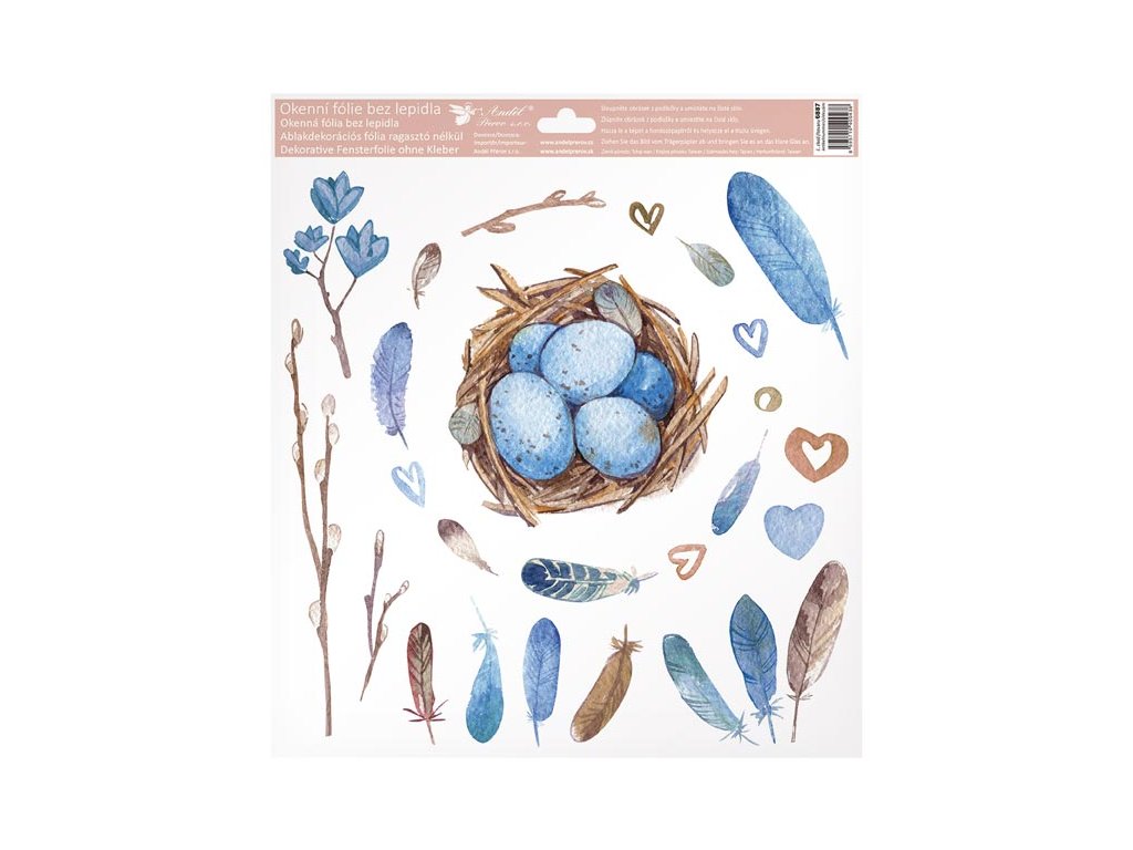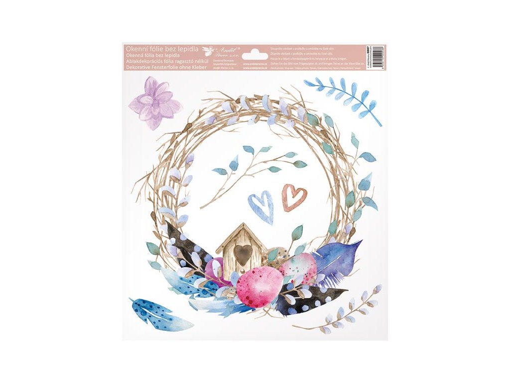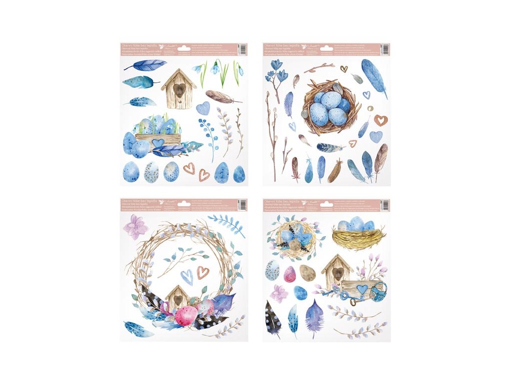 Dekoratívna okenná fólia s búdkou. Krásne okenné fólie s obrázkami vajíčok, pierok a vtáčích búdok. Na povrch sa lepia elektrostaticky, a preto nezanechávajú žiadne stopy. Vhodné na akýkoľvek hladký povrch, ako je sklo, výklady, zrkadlá alebo dlaždice. Čisté - bez lepidla - opakovane použiteľné. NÁVOD: 1. Pred použitím sa odporúča očistiť povrch od prachu a iných nečistôt. 2. Fólia sa ľahko aplikuje odstránením z podkladového papiera a umiestnením na hladký povrch. 3. Fóliu naneste a prípadné bubliny vyhlaďte rukou alebo suchou handričkou. 4. Po použití ich možno umiestniť na pôvodný podkladový papier a uskladniť na ďalšiu sezónu. Dodávame v mixe 4 ks podľa skladových zásob. Uvedená cena je za 1 ks.Dodatočné parametre