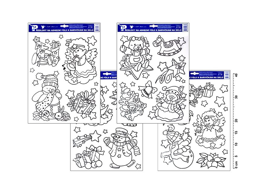 Predlohy s vianočnými motívmi na adhéznej fólii s vyvýšenou kontúrou. Predlohy na maľovanie na sklo. Fólia elektrostaticky priľne k povrchu. Môžete ich vyfarbiť farbičkami na sklo, fixkami alebo vodovými farbami. Vhodné na sklo, zrkadlo alebo inú hladkú plochu. Rozmer: 420 x 300 mm NÁVOD: Vyfarbite a po uschnutí umiestnite na čisté, prípadne navlhčené sklo, alebo inú čistú a hladkú plochu. Dodávame v mixe po 4 ks podľa skladovej zásoby. Uvedená cena je za 1 ks.Dodatočné parametre