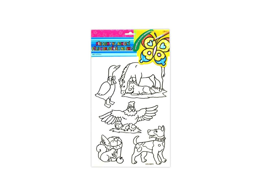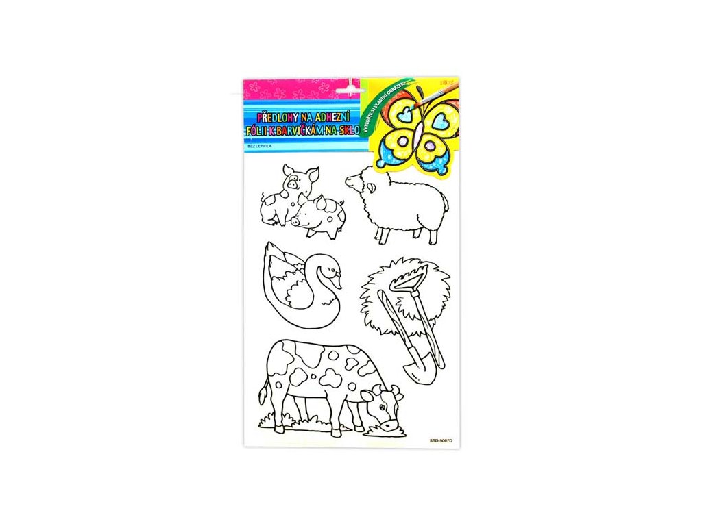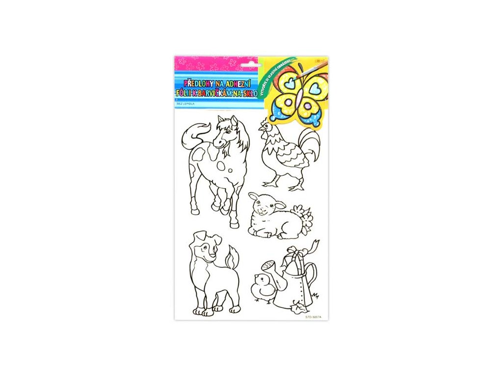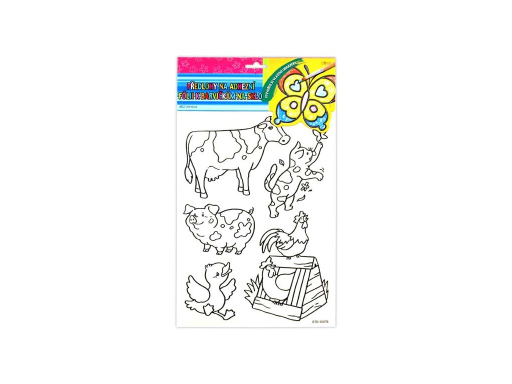 Predloha k farbičkám na sklo na adhéznu fóliu. Na predlohe sú obrázky zvierat na farme. Obrázok sa po vyfarbení a uschnutí umiestni na čisté sklo alebo inú hladkú plochu, na ktorú elektrostaticky priľne.Dodatočné parametre