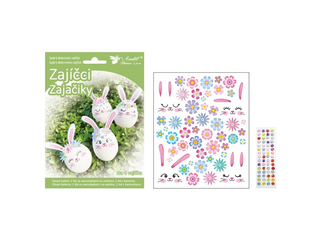 Sada na dekorovanie 4 ks vajíčok – zajačikovia. S týmito samolepkami ľahko a rýchlo ozdobíte vajíčko. V okamihu vytvoríte z obyčajného vajíčka hlavu zajačika podľa svojich predstáv. Takto netradične a originálne ozdobené vajíčka budú hlavnou ozdobou Veľkej noci. BALENIE OBSAHUJE: - 1 arch so samolepkami - 1 arch s kamienkami Sada je určená na dekorovanie 4 vajíčok. NÁVOD: 1. Pripravte si 4 natvrdo uvarené, vychladené a suché vajcia. 2. Opatrne vyberte pár očí z archu samolepiek a prilepte na vajce. 3. Vyberte uši, ohnite konce do strán a prilepte k vajíčku. 4. Vyberte kvietky a prilepte ich okolo uší. Pre 3D efekt ohnite okvetné lístky do strany. 5. Vyberte kamienky z druhého archu samolepiek a prilepte na vajíčko. Uvedená cena je za 1 balenie.Dodatočné parametre