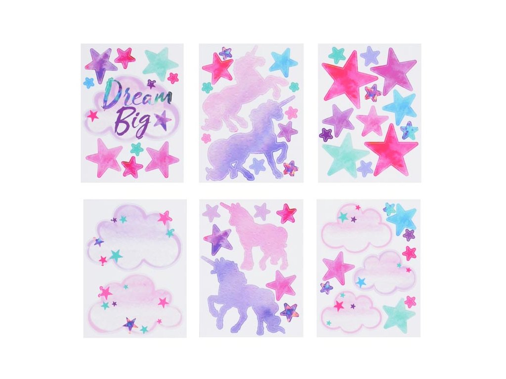 Dekoračné samolepky na stenu jednorožci (unicorn) a hviezdy. Samolepky sú vhodné na steny, dvere, okná, zrkadlá a iné hladké plochy. Táto samolepka na stenu v okamihu oživí Vašu obývačku, kúpeľňu, chodbu, detskú izbu či spálňu. BALENIE (BLOK) OBSAHUJE: - 6 hárkov NÁVOD: 1. Opatrne odstráňte samolepku z podkladového papiera. 2. Umiestnite ju na zvolenú suchú a čistú plochu. 3. Vyhlaďte ju od stredu k okrajom. Uvedená cena je za 1 balenie.Dodatočné parametre