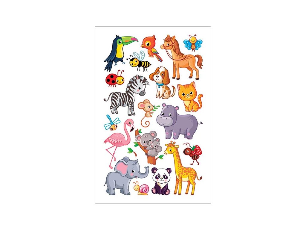 Tetovacie obtlačky - zvieratká. Tetovacie obtlačky s motívom zvieratiek. Sú vhodné na detské oslavy. NÁVOD: 1. Vystrihnite zvolený motív a odstráňte kryciu fóliu. 2. Obrázok pritlačte na čistú suchú pokožku. 3. Zhora vodou navlhčite podkladový papier obrázka, pridržte 20 sekúnd na pokožke a potom ho opatrne snímte. 4. Obrázok nechajte 60 sekúnd zaschnúť. Tetovanie je možné odstrániť pomocou liehu, krému, bežným umývaním alebo detským olejčekom. Uvedená cena je za 1 aršík.Dodatočné parametre