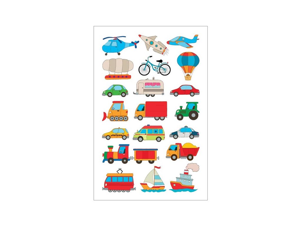 Tetovacie obtlačky - dopravné prostriedky. Tetovacie obtlačky s motívom dopravných prostriedkov. Sú vhodné na detské oslavy. NÁVOD: 1. Vystrihnite zvolený motív a odstráňte kryciu fóliu. 2. Obrázok pritlačte na čistú suchú pokožku. 3. Zhora vodou navlhčite podkladový papier obrázka, pridržte 20 sekúnd na pokožke a potom ho opatrne snímte. 4. Obrázok nechajte 60 sekúnd zaschnúť. Tetovanie je možné odstrániť pomocou liehu, krému, bežným umývaním alebo detským olejčekom. Uvedená cena je za 1 aršík.Dodatočné parametre