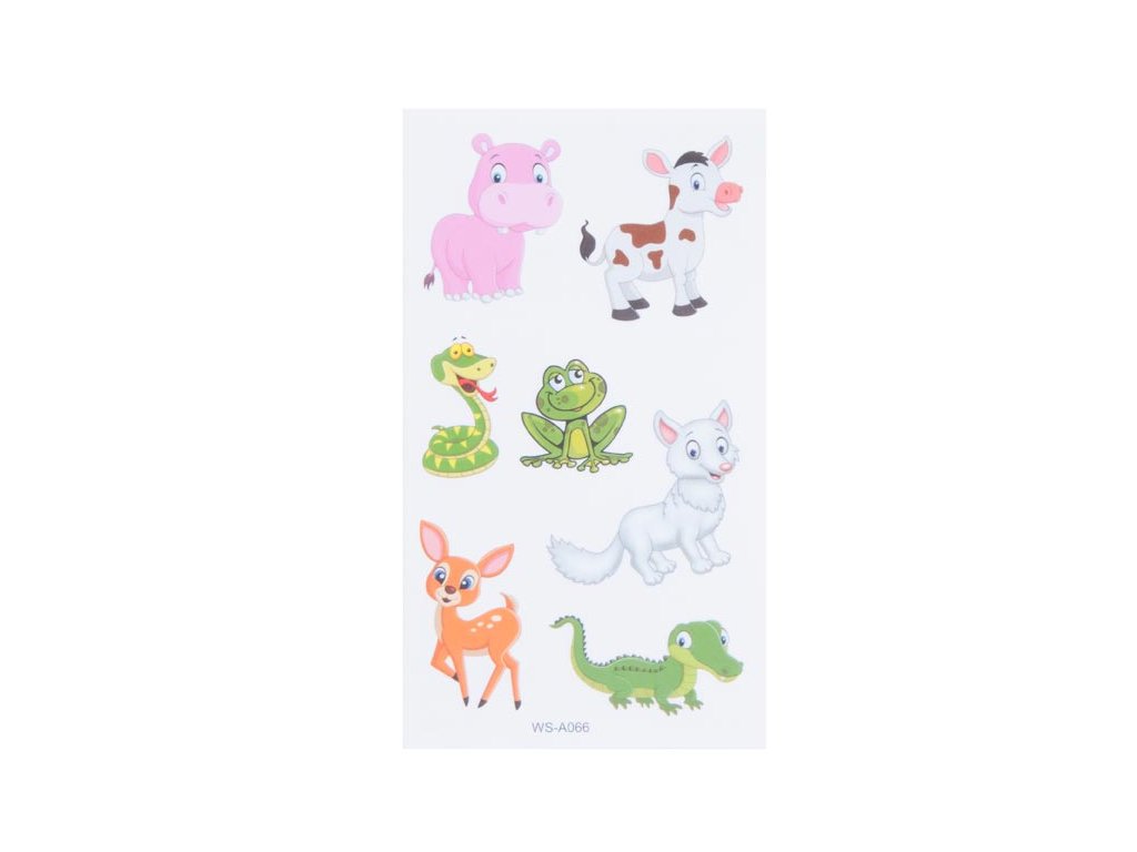 Tetovacie obtlačky - veselé zvieratká. Tetovacie obtlačky s motívmi veselých zvieratiek. Sú vhodné na detské oslavy, párty, karnevaly alebo ako darček priateľom. NÁVOD: 1. Vystrihnite zvolený motív a odstráňte kryciu fóliu. 2. Obrázok pritlačte na čistú suchú pokožku. 3. Zhora vodou navlhčite podkladový papier obrázka, pridržte 20 sekúnd na pokožke a potom ho opatrne snímte. 4. Obrázok nechajte 60 sekúnd zaschnúť. Tetovanie je možné odstrániť pomocou liehu, krému, bežným umývaním alebo detským olejčekom. Uvedená cena je za 1 aršík.Dodatočné parametre