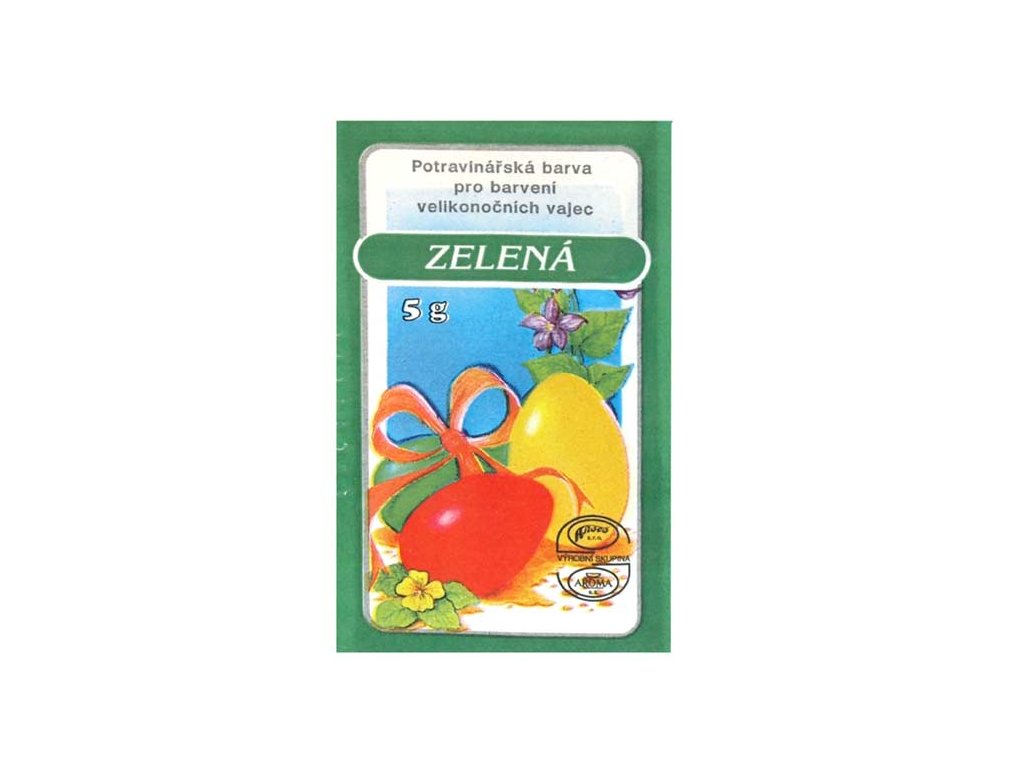 Jedno vrecko obsahuje 5 g potravinárskej farby na zafarbenie veľkonočných vajíčok na zeleno. Farba nesie označenie Český výrobok. NÁVOD NA POUŽITIE: 1. Obsah vrecúška rozpustite v 1/4 l vody (70 ° C), pridajte 1-2 lyžice octu. 2. Vložte čisté, odmastené a natvrdo uvarené vajcia na 2-5 minút. 3. Zafarbené vajíčka vyberte a nechajte uschnúť. Aby sa Vám vajíčka pekne leskli, nezabudnite ich po zafarbení potrieť tukom. Roztok postačí na zafarbenie až 15 ks vajec. Uvedená cena je za 1 ks.Dodatočné parametre