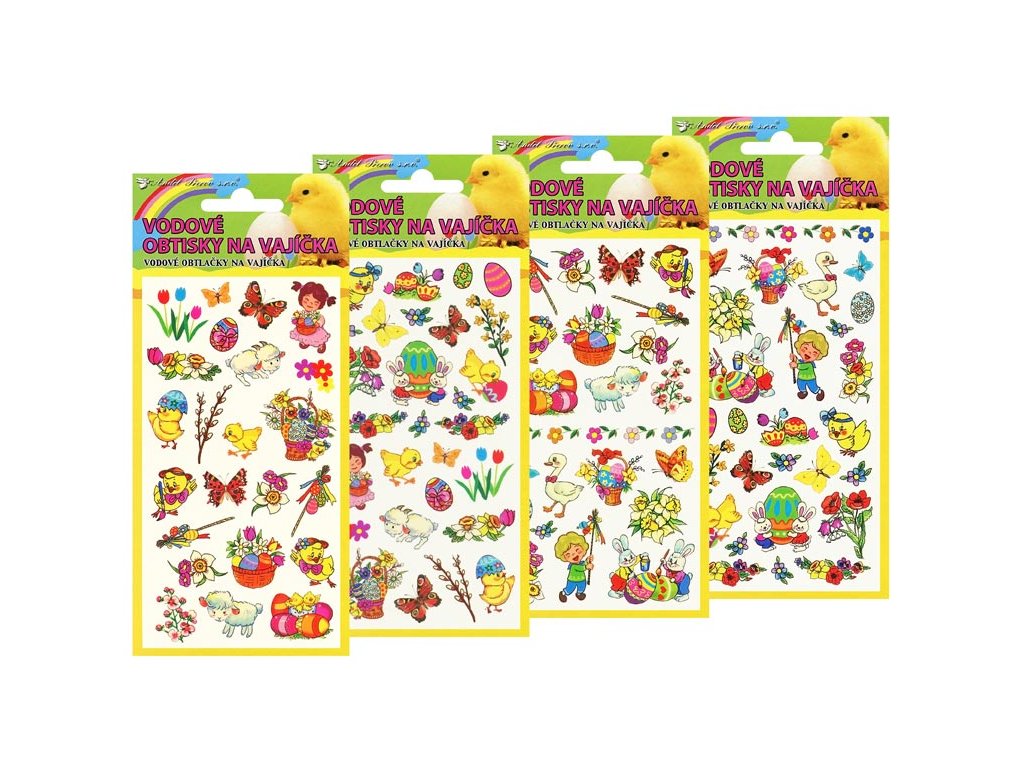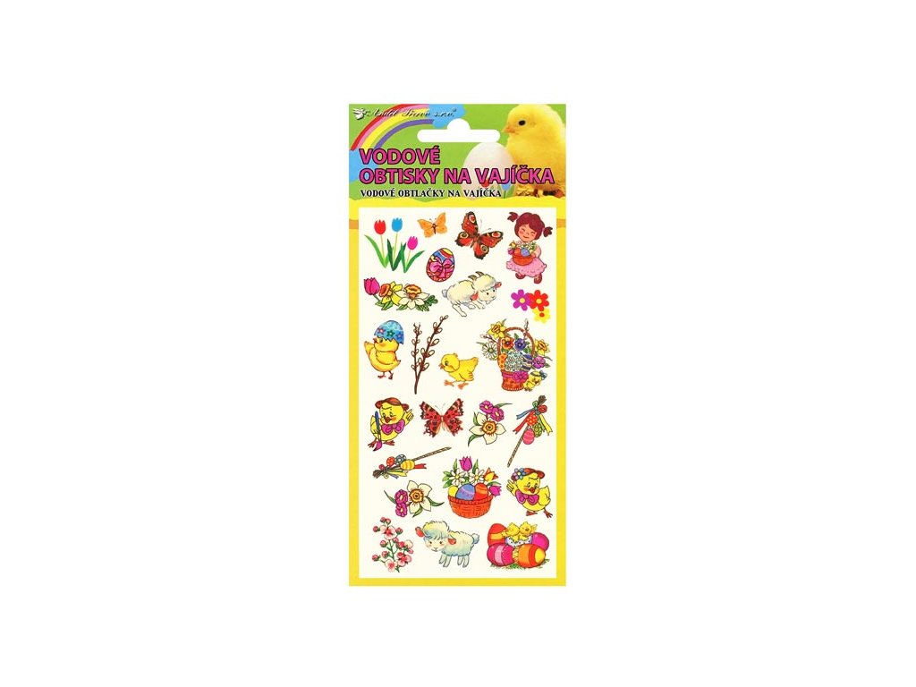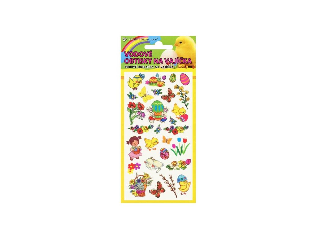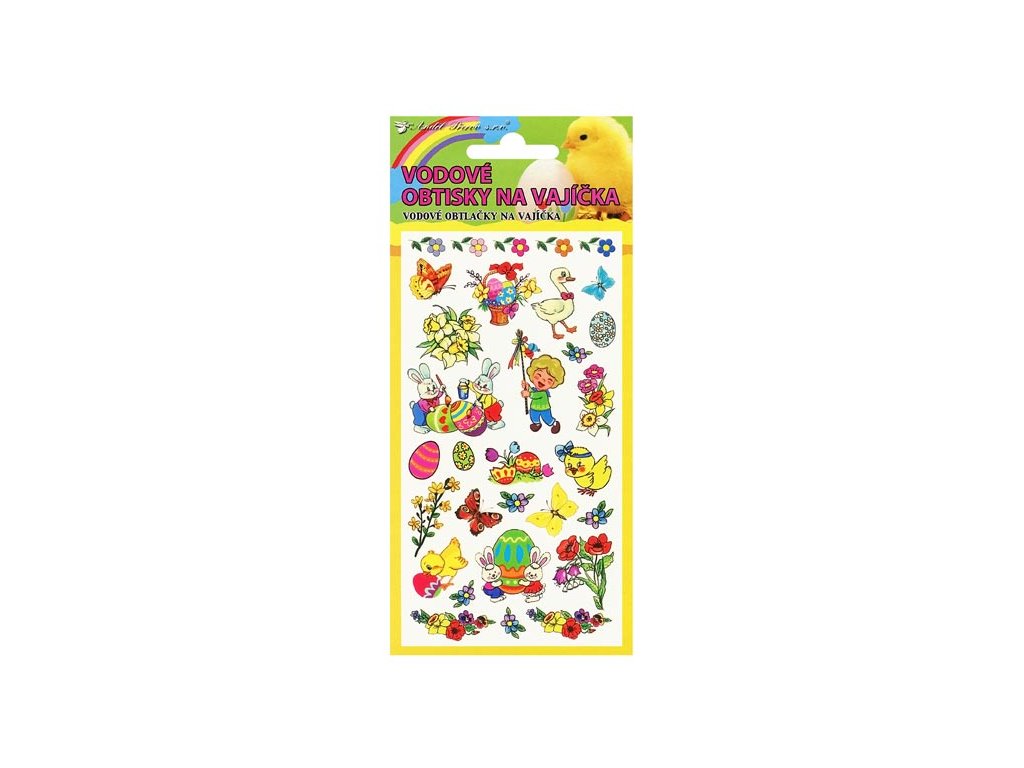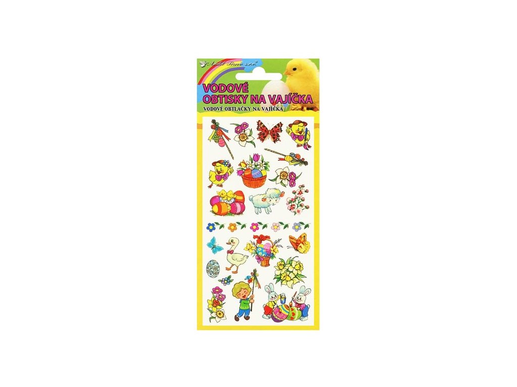 Vodové obtlačky na vajíčka s veľkonočnými motívmi. Na podkladovom papieri cca 28 farebných obtlačkov s rôznymi jarnými motívmi. Rozmer 19x9 cm. Návod na použitie: Vystrihnite zvolený motív, odstráňte kryciu fóliu a celý obrázok ponorte do misky s vodou. Priložte na varené vajíčko obrázkom na škrupinku, jemne pritlačte, počkajte 20-30 sekúnd a opatrne odstráňte podkladový papier. Nechajte zaschnúť.Dodatočné parametre