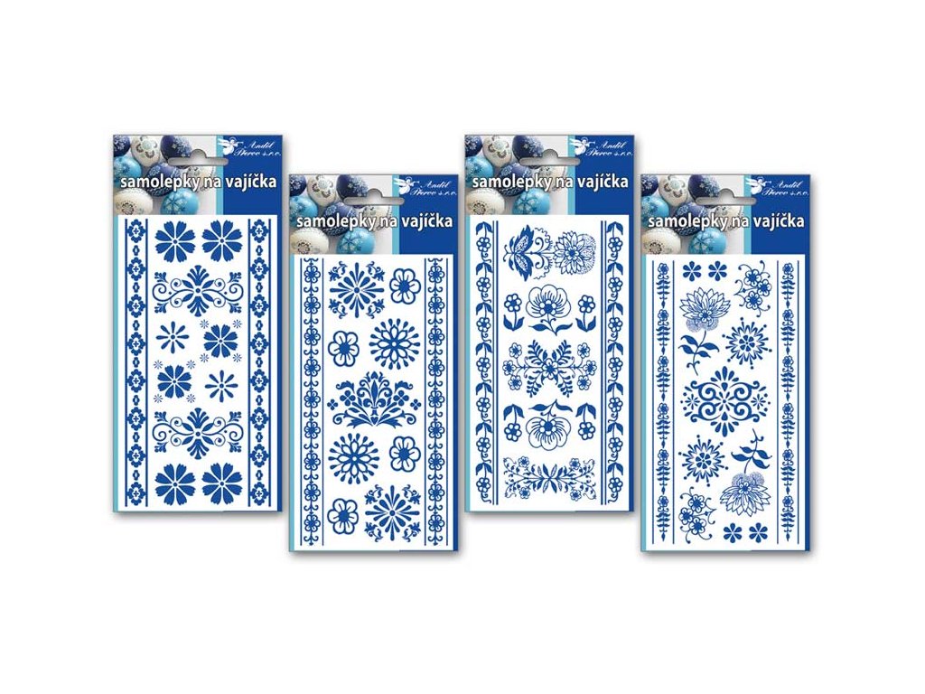 Samolepky na veľkonočné vajíčka v modrobielej farbe. Rozmer 19x9 cm. Návod na použitie: Vybraný motív vystrihnite vrátane podkladového papiera a krycej fólie. Odstráňte podkladový papier a zvoľte miesto pre obrázok. Použite čisté, odmastené a suché vajce. Pomocou krycej fólie opatrne obrázok pritlačte a prstom ľahko preškrabnite. Hneď ako sa obrázok uvoľní od fólie, opatrne ju odstráňte a obrázok jemne uhlaďte.Dodatočné parametre