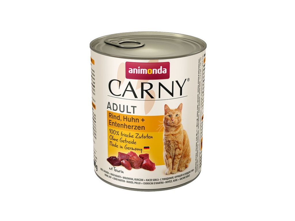 Carny Adult - Hovädzie, kura a kačacie srdcia je konzerva s obsahom len čerstvých mäsových častí, ktoré sú tým pravým pre Vašu mačku. Špeciálne prispôsobené na pokrytie nutričných potrieb dospelých mačiek. Receptúra s použitím len hydinového mäsa.Dodatočné parametre