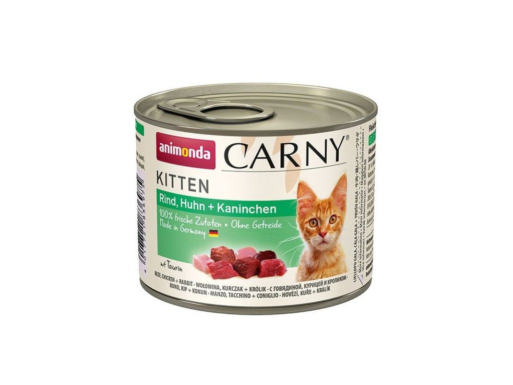 Carny Kitten - hovädzie, kura a králik je konzerva s obsahom len čerstvých mäsových častí, ktoré sú tým pravým pre Vaše mačiatko - veľkosť a tvar mäsových kúskov ideálne do úst mačiatok od 2. mesiacov.Dodatočné parametre