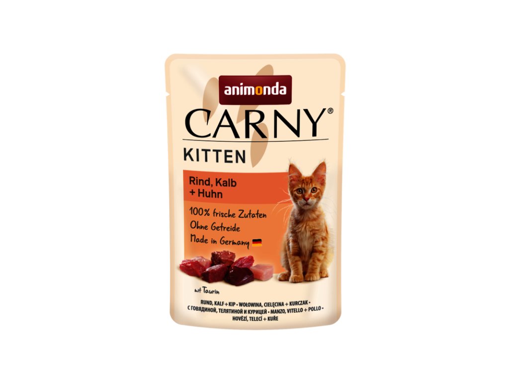 Carny Kitten - hovädzie, teľacie a kura je kapsička vyrobená len z čerstvých mäsových častí, ktoré sú tým pravým pre Vaše mačiatko - veľkosť a tvar mäsových kúskov ideálne do úst mačiatok od 2. mesiacov.Dodatočné parametre