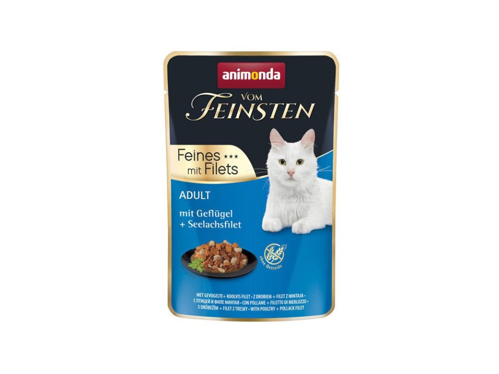 Animonda Vom Feinsten Feines mit Filets Adult Cat - Hydina a filety z tresky predstavuje kombináciu kúskov mäsa s jemnými filetami v lahodnej omáčke. Vyvážená a bezobilninová strava pre Vašu dospelú mačku.Dodatočné parametre