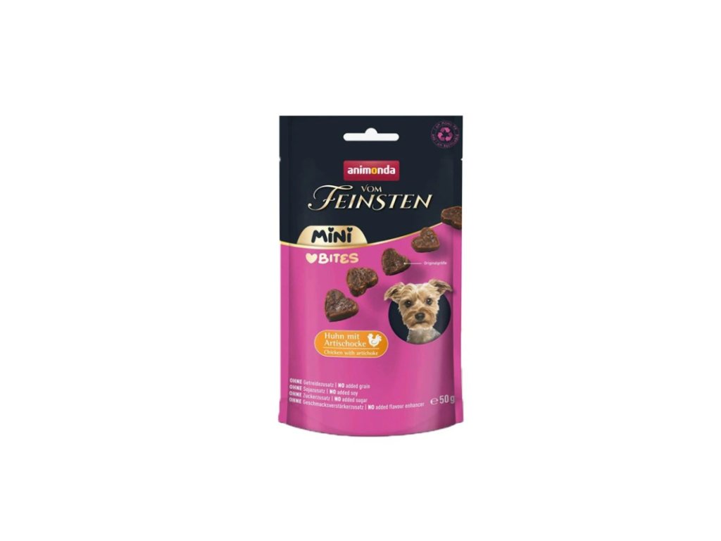 Animonda Vom Feinsten Mini Bites - Kuracie a artičoky je chutná odmena pre psov malých plemien s veľkých apetítom! Tieto maškrty v tvare srdiečka obsahujú vysoký podiel mäsa doplneným o artičoky, špeciálne navrhnuté tak, aby vyhoveli potrebám psov malých plemien.