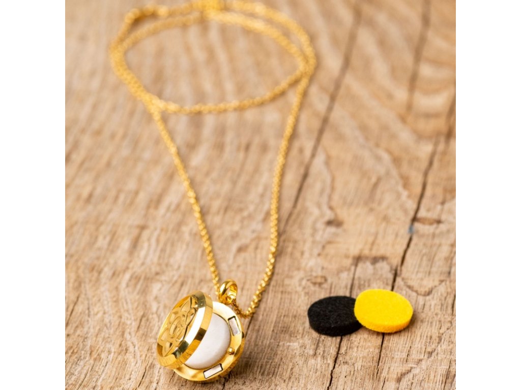 Malý medailón z nehrdzavejúcej ocele zlatej farby + 70cm zlatá retiazka + čierna zamatová taška + 3 tampóny z plste. Je to perfektný darček, ktorý si môžete dopriať alebo sami, alebo darovať tím, ktorí milujú kombináciu elegancie a pohody. Tento šperk z nehrdzavejúcej ocele ponúka originálny spôsob, ako využívať výhody éterických olejov. Stačí niekoľko kvapiek na malé plstené tampóny a difúzia môže začať. Je ideálny pre: Citlivú pokožku: vyrobený nehrdzavejúcej ocele. Vôňu éterických olejov si môžete vychutnať bez kontaktu s pokožkou. Pre začiatočníkov: jemný a elegantný spôsob, ako sa preniknúť do záhad aromaterapie a objavovať výhody éterických olejov. Pre pokročilých: táto metóda difúzie znamená, že si svoju obľúbenú kombináciu éterických olejov vychutnáte kdekoľvek. Pre obdarovaných: náhrdelník s medailónom a zmesou éterických olejov vo vnútri môže predstavovať jedinečný personifikovaný darček.Dodatočné parametre