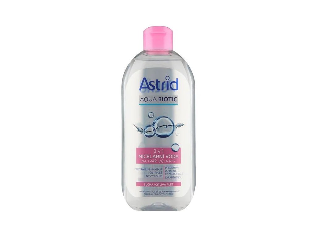 Micelárna voda Astrid 3 v 1 je dermatologicky a oftalmologicky testovaná, nevysušuje pokožku. Prebiotiká obsiahnuté v micelárnej vode pleť hydratujú a vyživujú. D-panthenol prítomný v Astrid Aqua Biotic sa vstrebe do pokožky, kde sa premení na kyselinu panthoténovú. Pleť tak zmäkčí a hydratuje. Svojimi hydratačnými, antibakteriálnymi, protizápalovými a regeneračnými účinkami ju zanechá pružnú a vláčnu. Kyselina hyalurónová nadviaže vodu v pleti, čím ju napne a vyhladí vrásky.Objem balenia 400ml.Dodatočné parametre