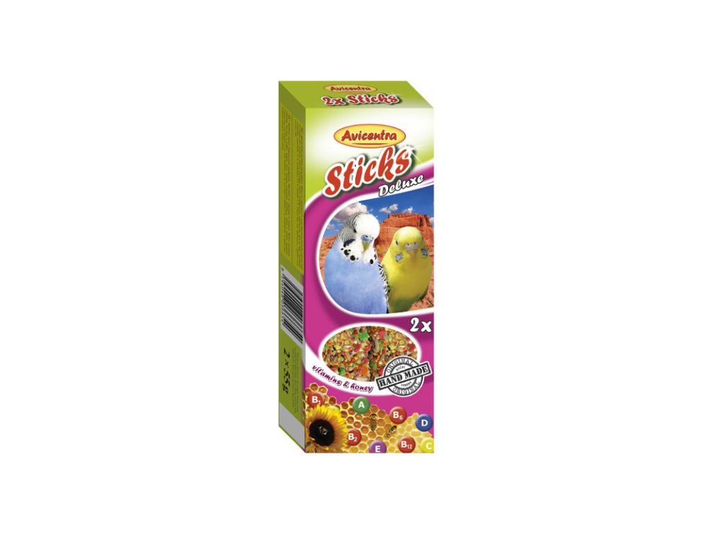 Avicentra tyčinka pre andulky s vitamínmi a medom 2x55g - doplnkové krmivo pre andulky. Tyčinky Avicentra s vitamínmi a medom sú výbornou pochúťkou, ale aj krmivom, ktoré vášmu miláčikovi dodáva dôležité vitamíny a minerály.Dodatočné parametre