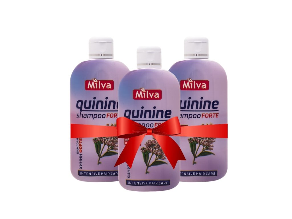 Balíček šampón chinín forte 3x 200 ml Vysoký obsah chinínu v šampóne ho robí efektívnym prípravkom proti vypadávaniu vlasov. Celkový stav vlasov sa rýchlo zlepší, zrýchli sa ich rast. Vypadávanie sa zníži alebo úplne prestane. Pokiaľ máte dlhšie vlasy, odporúčame skombinovať tento šampón s kondicionérom na lepšie rozčesanie. Chinín je horký, bezfarebný, amorfný práškový alebo kryštalický alkaloid, pôvodne izolovaný z kôry chinínovníka Cinchona succirubra. Tento alkaloid má stimulačné vlastnosti aktivujúce krvný obeh v oblastiach, kde je aplikovaný. V produktoch Milva je nanášaný na pokožku vlasov, kde účinne pôsobí. Chinín je účinná látka, ktorá: Rýchlo preniká do vlasovej pokožky. Urýchľuje mikrocirkuláciu. Spevňuje vlasové folikuly. Stimuluje rast zdravých a silných vlasov. Znižuje alebo úplne zastavuje vypadávanie vlasov. Zloženie: Aqua, Sodium Laureth-2 Sulfate, Cocamidopropyl Betaine, Glycerine, Sodium Chloride, Parfum, Citric Acid, Quinine, HCl Dihydrate, Methylcloroisothiazolinone, Methylisothiazolinone, CI 17200, Benzil Salicylate. Objem: 200ml Neobsahuje silikóny, nie je testovaný na zvieratach. Fotografia balíčku je ilustračná.Dodatočné parametre