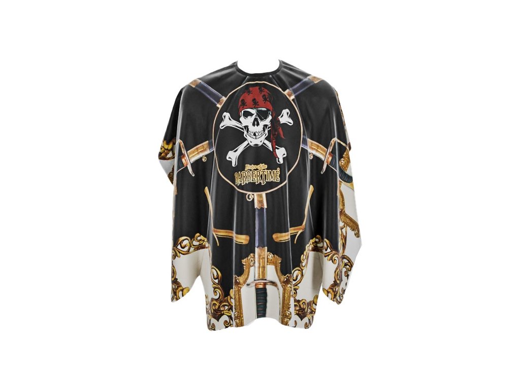 Štýlový holičský plášť pre zákazníka od značky Pirates of the BARBERTIME s obrázkami šablí a britev. S originálnym dizajnom sa hodí do každého barbershopu.