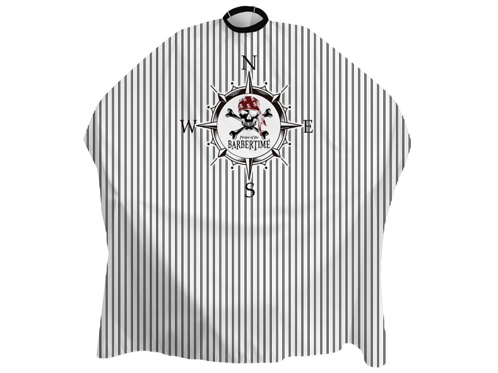 Štylová barber pláštenka pre zákazníka od značky Pirates of the BARBERTIME s bielymi a čiernymi pruhmi a vzorom pirátskeho kompasu. Vďaka svojmu originálnemu dizajnu sa hodí do každého barber shopu, holičstva a štýlového kaderníctva.