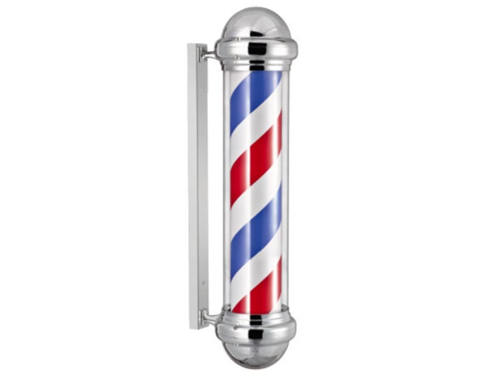 Tradičný barber pole THE SHAVE FACTORY vysoký 98,5 cm ideálny pre označenie barber shopu alebo holičstva. Vhodný pre vonkajšie použitie. Rotačný valec v "barber" farbách (biela, červená a modrá) je osvetlený LED svetlom, takže je veľmi dobre vidieť.
