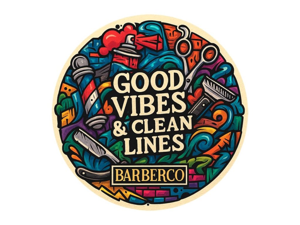 Štýlová barber samolepka BARBERCO Good vibes & clean lines z lesklého PVC. Priemer 10 cm, okrúhly tvar. Ideálny doplnok do každého barber shopu, na zrkadlo, dvere alebo pracovnú stanicu.