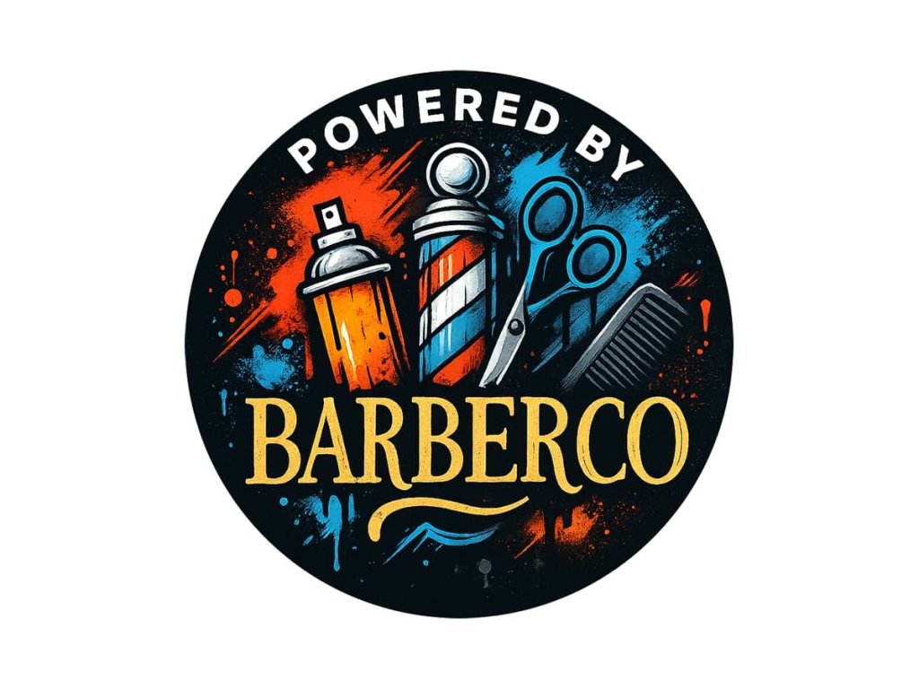 Štýlová barber samolepka Powered by BARBERCO z lesklého PVC. Priemer 10 cm, okrúhly tvar. Ideálny doplnok do každého barber shopu, na zrkadlo, dvere alebo pracovnú stanicu.