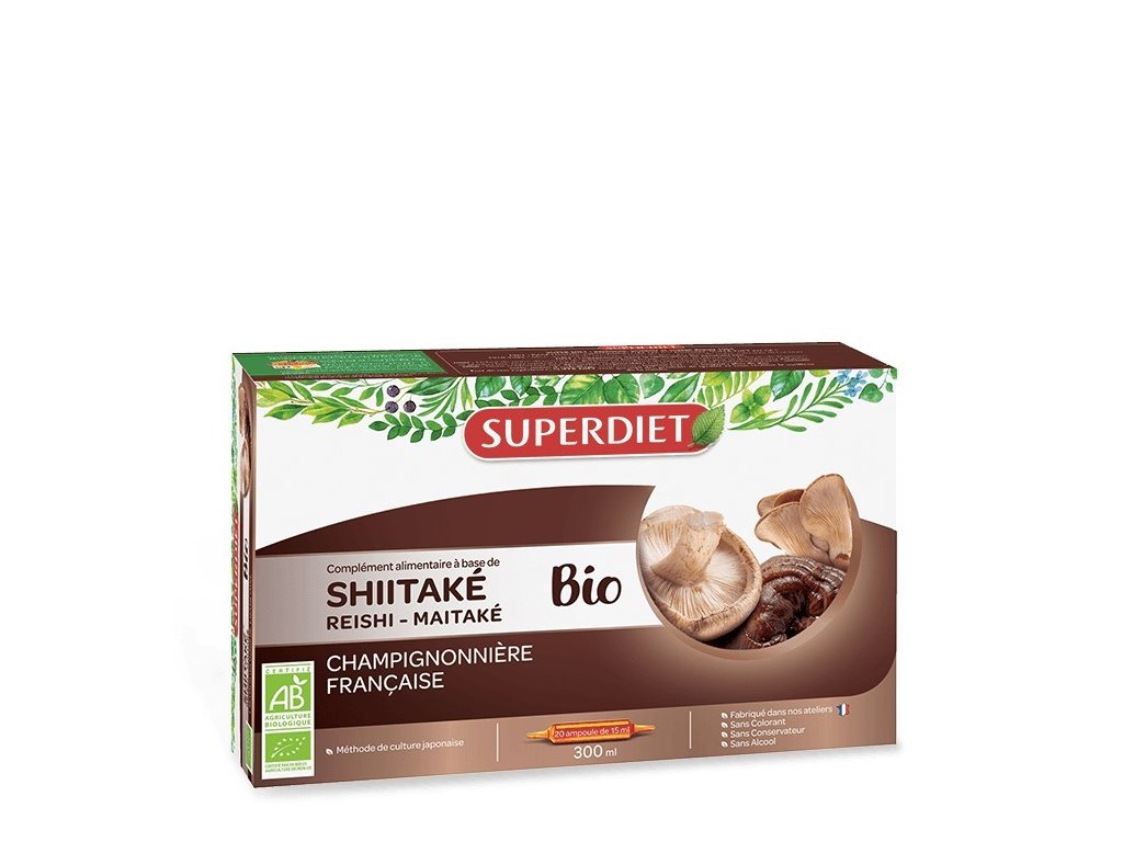 V Ázii využívajú prírodu a najmä huby po celé veky a aj preto sú vysoko vážení vo svojich tradičných postupoch. V laboratóriách Superdiet pre vás vybrali tri najlepšie huby vyrobené s použitím postupov ekologického poľnohospodárstva: Shiitake, Maitake a Reishi. Všetky Superdiet extrakty v ampulkách sú BEZ ALKOHOLU! Shiitake sa pestuje v Číne a Japonsku už asi 2000 rokov a bol vyhradený výlučne pre cisára a jeho dvor. Shiitake je neoddeliteľnou súčasťou ich kulinárskych tradícií a má dokonca náboženský význam. Reishi je divoká huba, ktorá rastie vo vzdialených horských lesoch v Ázii. Nakoniec, maitake je hnedá lamelová huba, ktorá pôvodne rástla na pňoch a koreňoch stromov v severovýchodnom Japonsku. V Japonsku je známa ako kráľovná húb. V laboratóriá Superdiet sme vybrali prvotriedne huby pestované podľa japonských postupov vo francúzskych hubových záhonoch a následne z nich tvoríme tento doplnok stravy - Shitake Reishi Maitake. Pri dennej dávke podľa odporúčaného používania vaše telo dostane až 1800 mg výťažku z húb Shiitake, 75 mg Reishi a 75 mg Maitake. ODPORÚČANÉ UŽÍVANIE: 1 až 2 ampulky denne vhodné pre celú rodinu od 6 rokov Tip: Ak máte slabú imunitu a potrebujete ju posilniť, používajte tento produkt spolu s extraktom z echinacey alebo extraktom z grepových jadierok. Upozornenie Tento produkt neodporúčame používať tehotným a dojčiacim ženám, odporúčame rešpektovať dávky, ktoré sú odporúčané a viesť zdravý životný štýl s vyváženou a pestrou stravou. Uchovávajte mimo dosahu malých detí. Len perorálne použitie - nevhodné na injekciu. trojica húb, ktoré napomáhajú imunite organizmu. Tento produkt je vytvorený z trojice ázijských imunitných húb Shiitake, Reishi a Maitake. Vhodný je najmä ako prevencia v zimnom období, kedy sa vyskytuje množstvo chorôb. Je vhodné používať ho ako prevenciu pred týmito chorobami (posilnenie imunity). Slúži ako podpora pri vírusových ochoreniach, má protirakovinové a protizrážavé účinky a je preto vhodnou alternatívou pre ľudí alergických na včelie produkty. Trojica použitých húb je pestovaná a spracovaná pomocou tradičnej japonskej metódy (bez kontaktu s pôdou, neobsahujú toxické chemikálie ani čiastočky škodlivého znečistenia).Dodatočné parametre