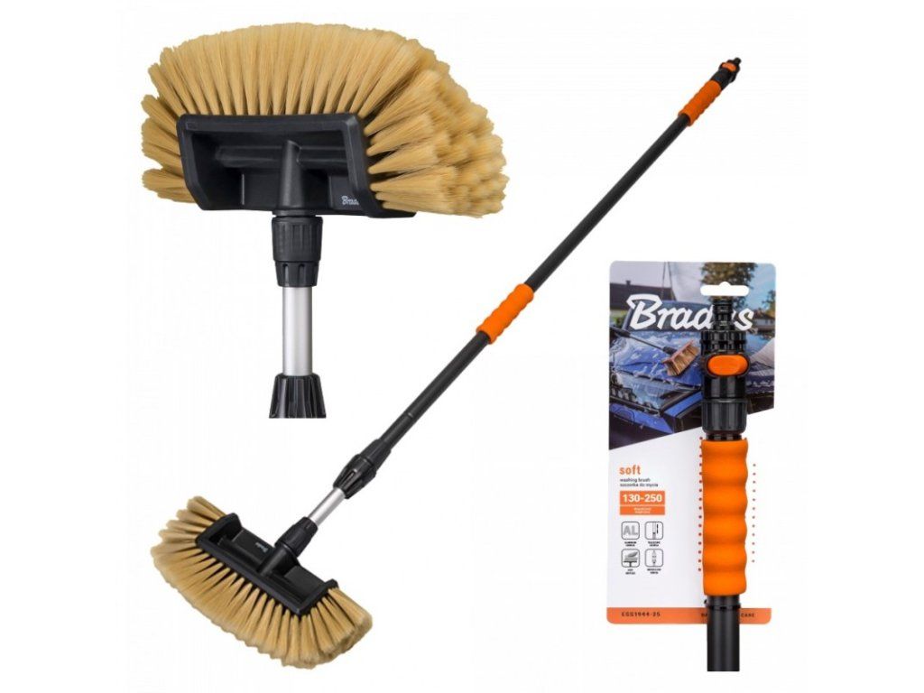 Bradas umývacia kefa s ventilom SOFT 130-250 cm Kefa SOFT je ideálna na umývanie áut, dodávok, karavanov a pod. Je vhodná aj na práce okolo domu a záhrady, zimnej záhrady alebo verandy. Charakteristika: - vybavená teleskopickou hliníkovou rukoväťou - plynulé nastavenie dĺžky tyče (130-250cm) - šírka kefy: 10" - má spínač prietoku vody - ukončená rýchloupínacou vsuvkou - štetiny kefy sú dodatočne zmäkčené, čím sú šetrnejšie k umývanému povrchu - špeciálne uchytenie rukoväte zabraňuje otáčaniu hlavy Výhody kefy: - jemné štetinky SOFT chránia povrch laku auta pred poškriabaním počas používania - pohodlné používanie - inovatívny vzhľad - dobrá pružnosť - odolnosť voči vysokej teplote - vyrobené z ekologických materiálov - štetiny sa nedelaminujú a nepraskajú Cena je za 1 ksDodatočné parametre