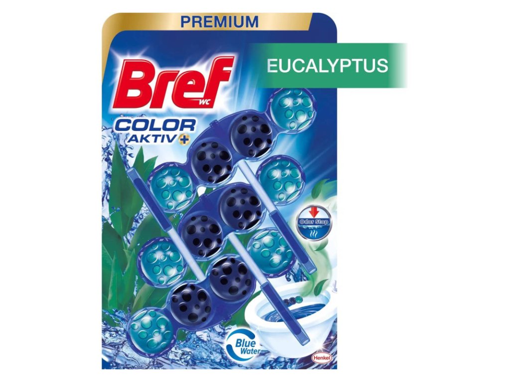 BREF WC blok  Blue Aktiv Eucalyptus 3 x 50 g WC blok na hygienickú čistotu a sviežosť vašej toalety Nové zloženie kolekcie WC blokov Color Activ zaručuje o 50 % viac lesku* na povrchu toalety (*v porovnaní so suchým povrchom bez použitia WC bloku) WC blok BREF Color Aktiv chráni toaletu pred tvorbou vodného kameňa a zabraňuje zadržiavaniu nečistôt Viditeľný čistiaci zážitok s modrou vodou udržuje čistú toaletu WC blok BREF s vôňou eukalyptu prevonia celú miestnosť Aktívnou zložkou je čistiaca pena, ktorá čistí toaletu pri každom spláchnutí – WC blok BREF je tak najľahší spôsob ako udržať vašu toaletu čistú a so sviežou vôňou kvetov Cena je za bal./3 ks
