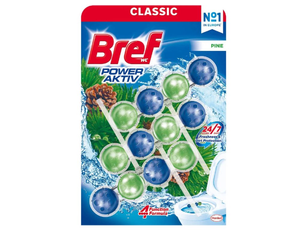 BREF wc blok  Power Aktiv Pine 3 × 50 g Čistiaca pena čistí toaletu pri každom spláchnutí Ochrana pred tvorbou vodného kameňa WC blok  Bref Power Aktiv chráni toaletu pred usadzovaním nečistôt Technológia Air Freshener zabezpečí, aby vaša toaleta voňala až do posledného spláchnutia Najjednoduchšia cesta, ako udržať vašu toaletu čistú a sviežu Vďaka praktickému tvaru WC blok BREF dokonale sedí pod okrajom toalety S každým spláchnutím zanecháva sviežu vôňu borovice Vydrží až 240 spláchnutí Cena je za bal./3x50g