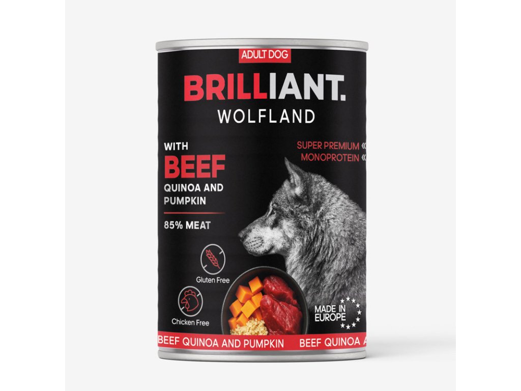 Brilliant Wolfland with Beef, Quinoa and Pumpkin je hypoalergénna konzerva s obsahom jedinej živočíšnej bielkoviny v podobe hovädzieho mäsa doplneného o tekvicu a quinou na zlepšenie trávenia. 85% výberovej hovädzej svaloviny s celými kúskami tekvice a quinoa. Naše krmivo Brilliant Wolfland je vhodné aj pre psov s citlivým trávením, potravinovou intoleranciou a alergiou na iné druhy živočíšnych bielkovín.Dodatočné parametre