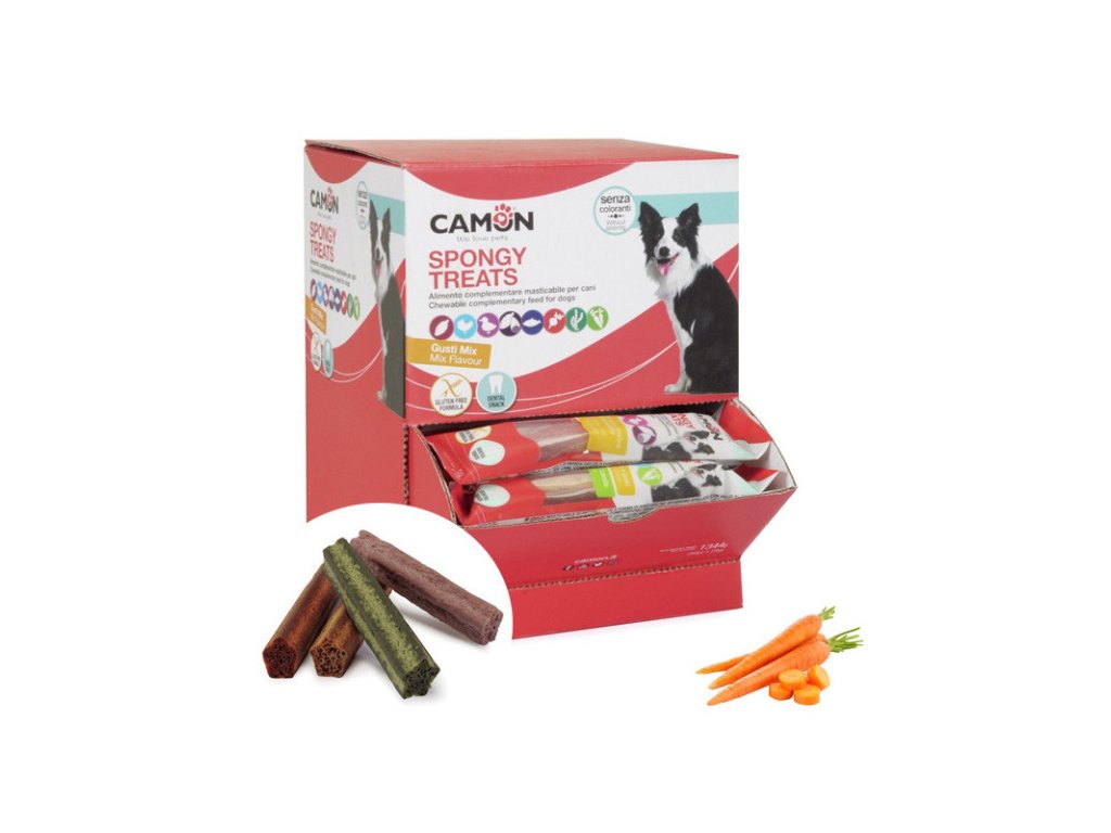 Camon Dental Dog Spongy Treats sú dentálne bezobilninové tyčinky s textúrou pripomínajúcou špongiu. Vďaka tejto textúre dokonale vyčistia zuby Vášho psa. Vhodné pre šteňatá a psov všetkých plemien starších ako 6 mesiacov.Dodatočné parametre