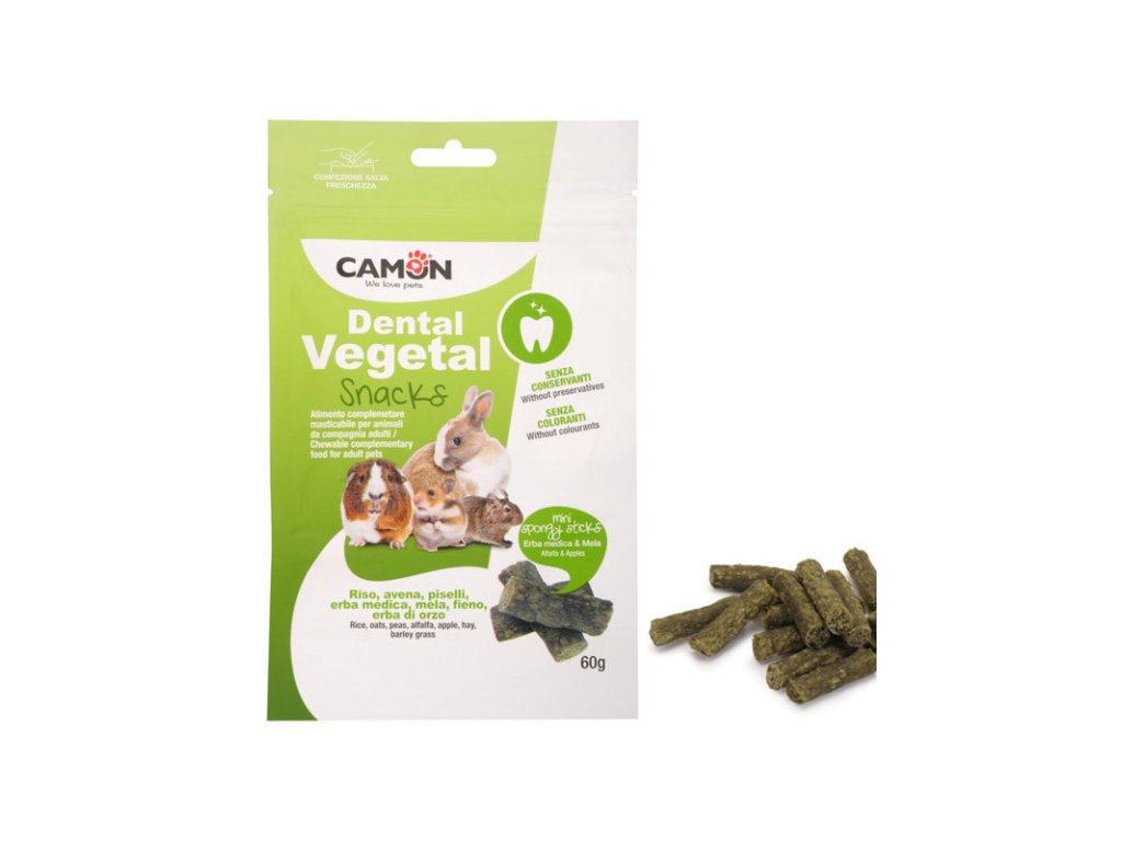 Camon Dental Vegetal Snacks - dentálna pochúťka v tvare tyčinky je špeciálna doplnková strava pre všetky hlodavce určená na hryzanie. Tvrdá textúra tohto snacku zabezpečí dentálnu hygienu pre Vášho hlodavca. S prídavkom byliniek a jablka.Dodatočné parametre