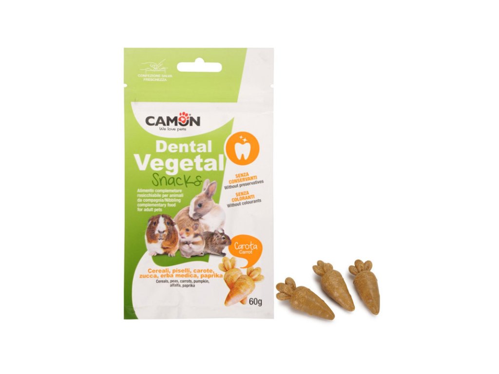 Camon Dental Vegetal Snacks - dentálna pochúťka v tvare mrkvy je špeciálna doplnková strava pre všetky hlodavce určená na hryzanie. Tvrdá textúra tohto snacku zabezpečí dentálnu hygienu pre Vášho hlodavca.Dodatočné parametre