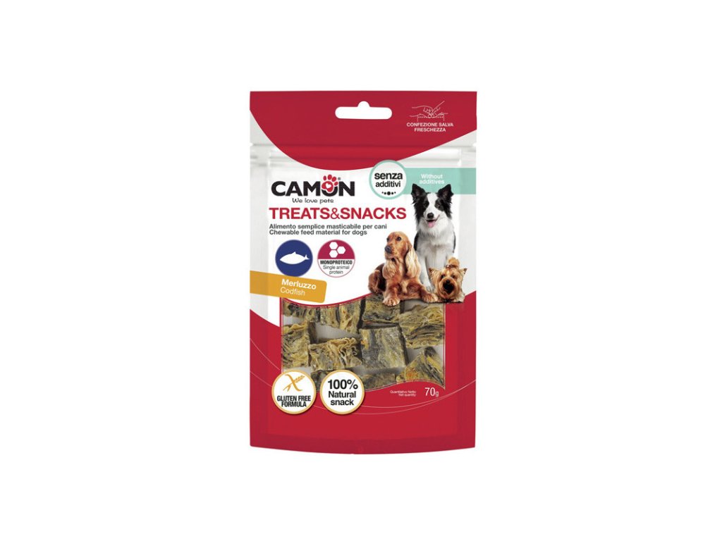 Camon Treats & Snacks predstavujú chutnú formu bezlepkových pamlskov z kože tresky pre Vášho psa alebo šteňa, ktorou môžete odmeniť svojho miláčika kedykoľvek počas dňa. Obsahuje mikrošupiny, ktoré dokonale vyčistia chrup Vášho psa.Dodatočné parametre