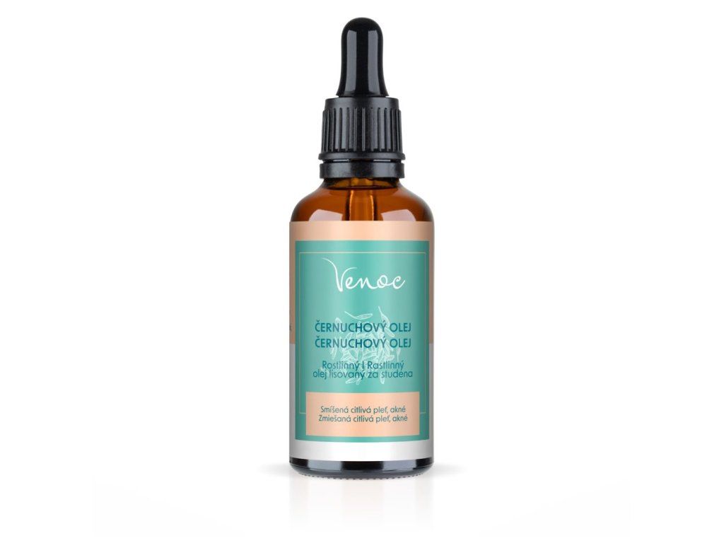 Olej z čiernej rasce Venoc je 100 % prírodný pleťový olej z oleja semien Nigella sativa (black cumin) určený najmä pre zmiešanú a citlivú pleť so sklonom k akné. Jemne upokojuje podráždenú pokožku, pomáha zmierniť pocity začervenania a diskomfortu a podporuje prirodzenú regeneráciu kožnej bariéry. Vďaka vyváženému zloženiu mastných kyselín napomáha vyrovnávať tvorbu kožného mazu bez zbytočného zaťažovania pórov. Pri pravidelnom používaní zanecháva pleť hebkú, zjemnenú a opticky vyhladenejšiu, bez ťažkého mastného pocitu na pokožke. Je ideálny pre tých, ktorí hľadajú šetrnú, ale účinnú prírodnú starostlivosť o zmiešanú, citlivú a problematickú pleť.
