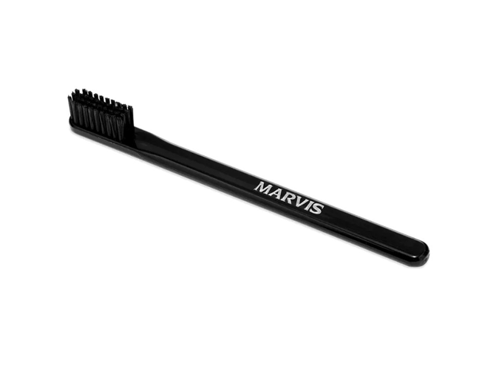 Elegantná čierna zubná kefka od legendárnej talianskej značky MARVIS. Má stredne tvrdé a rovno zastrihnuté čierne vlákna.