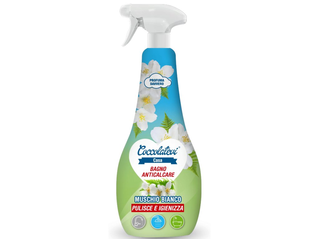COCCOLATEVI Čistič kúpeľne Biele pižmo je produkt s inovatívnym a super voňavým zložením, ktorý efektívne odstraňuje vodný kameň na všetkých povrchoch Vašej kúpeľne a zároveň ju príjemne prevonia. Inovatívna formula zároveň ničí baktérie a choroboplodné zárodky.