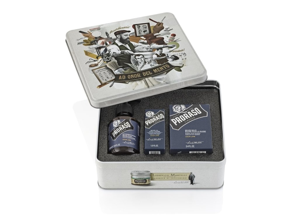 Taliansky štýl skrytý v plechovom balení. Darčeková sada na starostlivosť o bradu PRORASO Azur lime obsahuje šampón, balzam a olej na bradu - všetky produkty majú stredomorskú citrusovú vôňu.. Všetko starostlivo zabalené v štýlovo pomaľovanej plechovej krabičke.