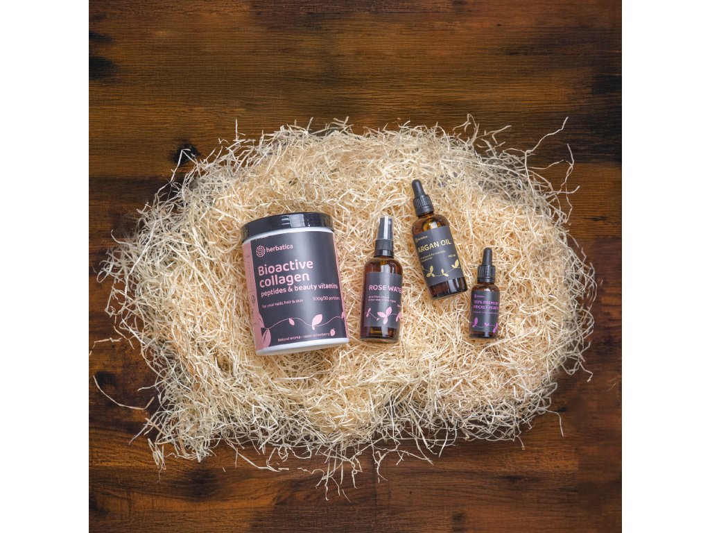 Tento set predstavuje kompletný rituál krásy pre pleť, vlasy aj nechty. Bioaktívny kolagén podporuje pevnosť pokožky, rast vlasov a zdravé nechty zvnútra. Arganový, opunciový olej a ružová voda zabezpečujú intenzívnu hydratáciu, výživu a prirodzený jas pleti. Ideálny ako darček aj pre každodennú starostlivosť o krásu v čisto prírodnom podaní.